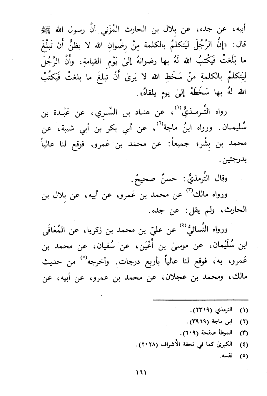 أَبِيهِ، عن جده، عن بلال بْنِ الْحَارِثِ الْمُزَنِيِّ أَنَّ رَسُولَ اللَّهِ صلى الله عليه وسلم قال: إِنَّ الرَّجُلَ لَيَتَكَلَّمُ بِالْكَلِمَةِ مِنْ رِضْوَانِ اللَّهِ لا يَظُنُّ أَنْ تَبْلُغَ مَا بَلَغَتْ فَيَكْتُبُ اللَّهُ لَهُ بِهَا رِضْوَانَهُ إِلَى يَوْمِ الْقِيَامَةِ، وأَنَّ الرَّجُلَ لَيَتَكَلَّمُ بِالْكَلِمَةِ مِنْ سَخَطِ اللَّهِ لا يَرَى أَنْ تَبْلُغَ مَا بَلَغَتْ فَيَكْتُبُ اللَّهُ لَهُ بِهَا سَخَطَهُ إِلَى يَوْمِ يَلْقَاهُ.