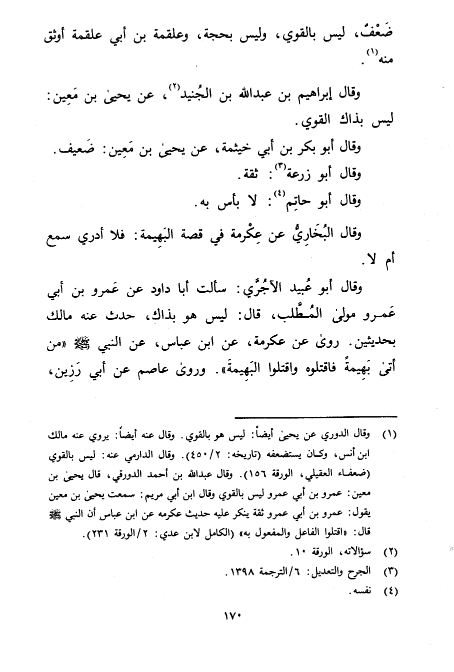 (1) وَقَال الدوري عن يحيى أيضا: ليس هو بالقوي. وَقَال عنه أيضا: يروي عنه مالك ابن أنس، وكان يستضعفه (تاريخه: 2 / 450) . وَقَال الدارمي عَنه: ليس بالقوي (ضعفاء العقيلي، الورقة 156) . وَقَال عَبد اللَّهِ بْن أَحْمَد الدورقي، قال يَحْيَى بْن مَعِين: عَمْرو بن أَبي عَمْرو ليس بالقوي وَقَال ابن أَبي مريم: سمعت يحيى بْن مَعِين يقول: عَمْرو بن أَبي عَمْرو ثقة ينكر عليه حديث عكرمة عَنِ ابن عباس أَنَّ النَّبِيَّ صلى الله عليه وسلم قال: اقتلوا الفاعل والمفعلو به " (الكامل لابن عدي: 2 / الورقة 231) .