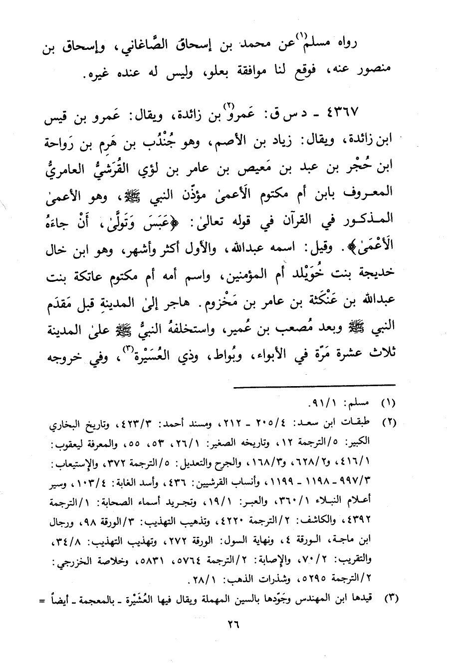4367 - د س ق: عَمْرو بن زائدة (2) ، ويُقال: عَمْرو بن قيس ابن زائدة، ويُقال: زياد بن الأصم، وهو جندب بن هرم بن رواحة ابن حجر بن عبد بن معيص بن عامر بن لؤي القرشي العامري المعروف بابن أم مكتوم الأعمى مؤذن النبي صَلَّى اللَّهُ عَلَيْهِ وسَلَّمَ، وهو الأعمى المذكور في القرآن في قوله تعالى: {عبس وتولى، أن جاءه الأعمى} .