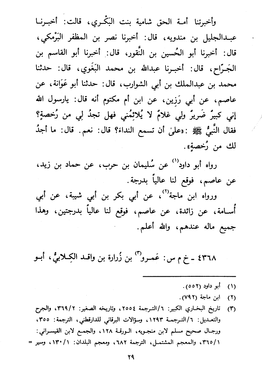 وأَخْبَرَتْنَا أَمَةُ الْحَقِّ شَامِيَّةُ بِنْتُ الْبَكْرِيِّ، قَالَتْ: أَخْبَرَنَا عَبْدُ الْجَلِيلِ بْنِ مَنْدَوَيْهِ، قال: أَخْبَرَنَا نَصْرُ بْنُ الْمُظَفَّرِ الْبَرْمَكِيُّ، قال: أَخْبَرَنَا أَبُو الحسين بْن النقور، قال: أَخْبَرَنَا أَبُو الْقَاسِمِ بْنُ الْجَرَّاحِ، قال: أَخْبَرَنَا عَبد الله بْن مُحَمَّدٍ الْبَغَوِيُّ، قال: حَدَّثَنَا مُحَمَّدُ بْن عَبد المَلِك بْن أَبي الشَّوَارِبِ، قال: حَدَّثَنَا أَبُو عُوَانَةَ، عَنْ عَاصِمٍ، عَن أَبِي رُزَيْنٍ، عن ابن أم مكتوم أن قال: يَا رَسُولَ اللَّهِ إِنِّي كَبِيرٌ ضَرِيرٌ ولِي غُلامٌ لا يُلائِمُنِي فَهَلْ تَجِدَ لِي مِنْ رُخْصَةٍ؟ فَقَالَ النَّبِيُّ صَلَّى اللَّهُ عليه وسلم: "عَلَى أَنْ تَسْمَعَ النَّدَاءَ؟ قال: نَعَمْ. قال: مَا أَجِدُ لَكَ مِنْ رُخْصَةٍ.
