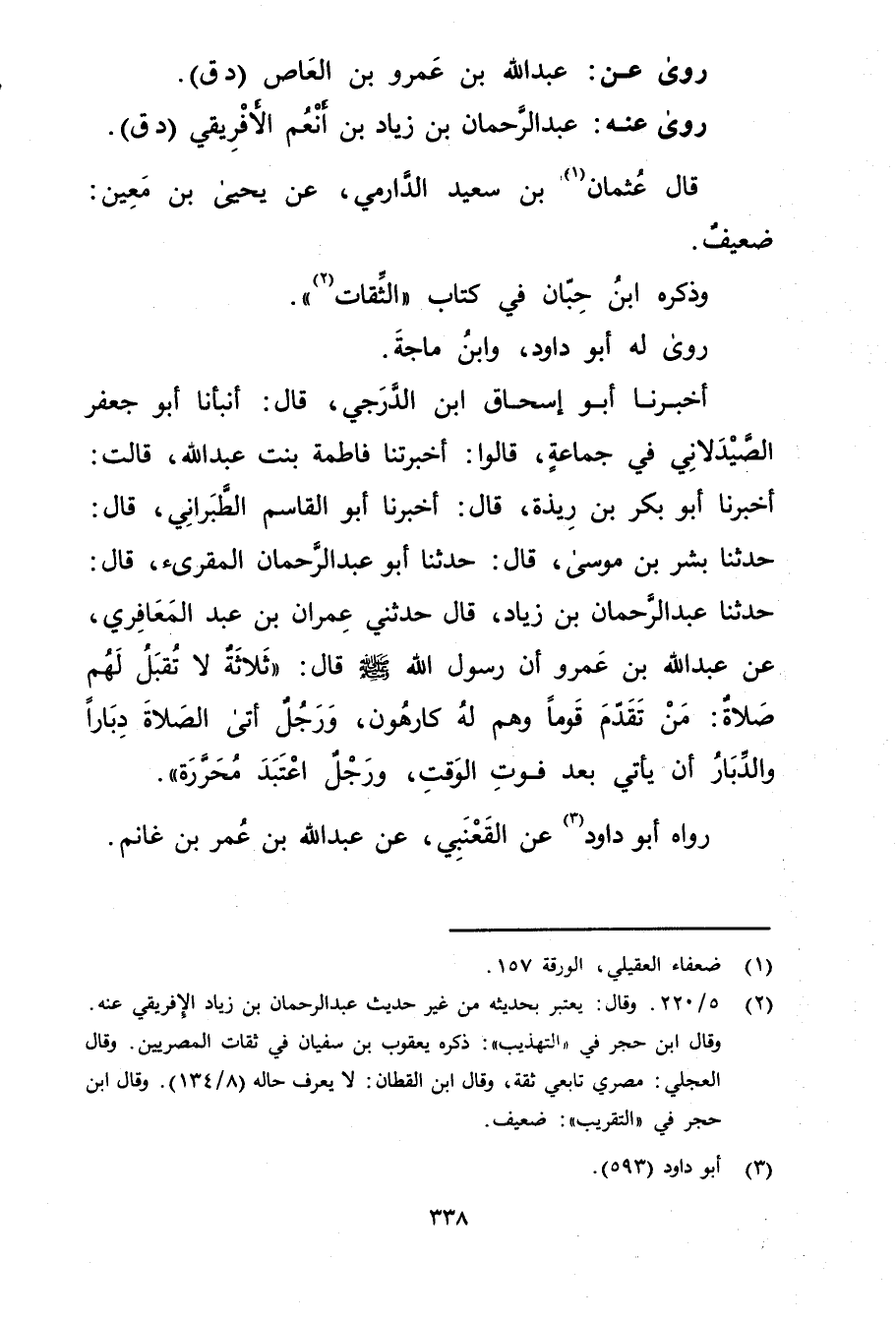 أخبرنا أَبُو إِسْحَاقَ ابْنُ الدَّرَجِيِّ، قال: أَنْبَأَنَا أَبُو جَعْفَرٍ الصَّيْدَلانِيُّ فِي جَمَاعَةٍ، قَالُوا: أَخْبَرَتْنا فَاطِمَةُ بِنْتُ عَبد اللَّهِ، قَالَتْ: أخبرنا أَبُو بَكْرِ بْنُ رِيذَةَ، قال: أخبرنا أَبُو الْقَاسِمِ الطَّبَرَانِيُّ، قال: حَدَّثَنَا بِشْرُ بْنُ مُوسَى، قال: حَدَّثَنَا أَبُو عَبْدِ الرَّحْمَنِ الْمُقْرِئِ، قال: حَدَّثَنَا عَبْدُ الرحمن بْن زياد، قال حَدَّثَنِي عِمْران بْنُ عَبْدٍ الْمَعَافِرِيُّ، عَنْ عَبد اللَّهِ بْنِ عَمْرو أَنَّ رَسُول اللَّهِ صلى الله عليه وسَلَّمَ قال: ثَلاثَةٌ لا تُقْبَلُ لَهُمْ صَلاةٌ: مَنْ تَقَدَّمَ قَوْمًا وهم لَهُ كَارِهُونَ، ورَجُلٌ أَتَى الصَّلاةَ دِبَارًا والدِّبَارُ أَنْ يَأْتِيَ بَعْدَ فَوْتِ الْوَقْتِ، ورَجُلٌ اعْتَبَدَ مُحَرَّرَهُ.