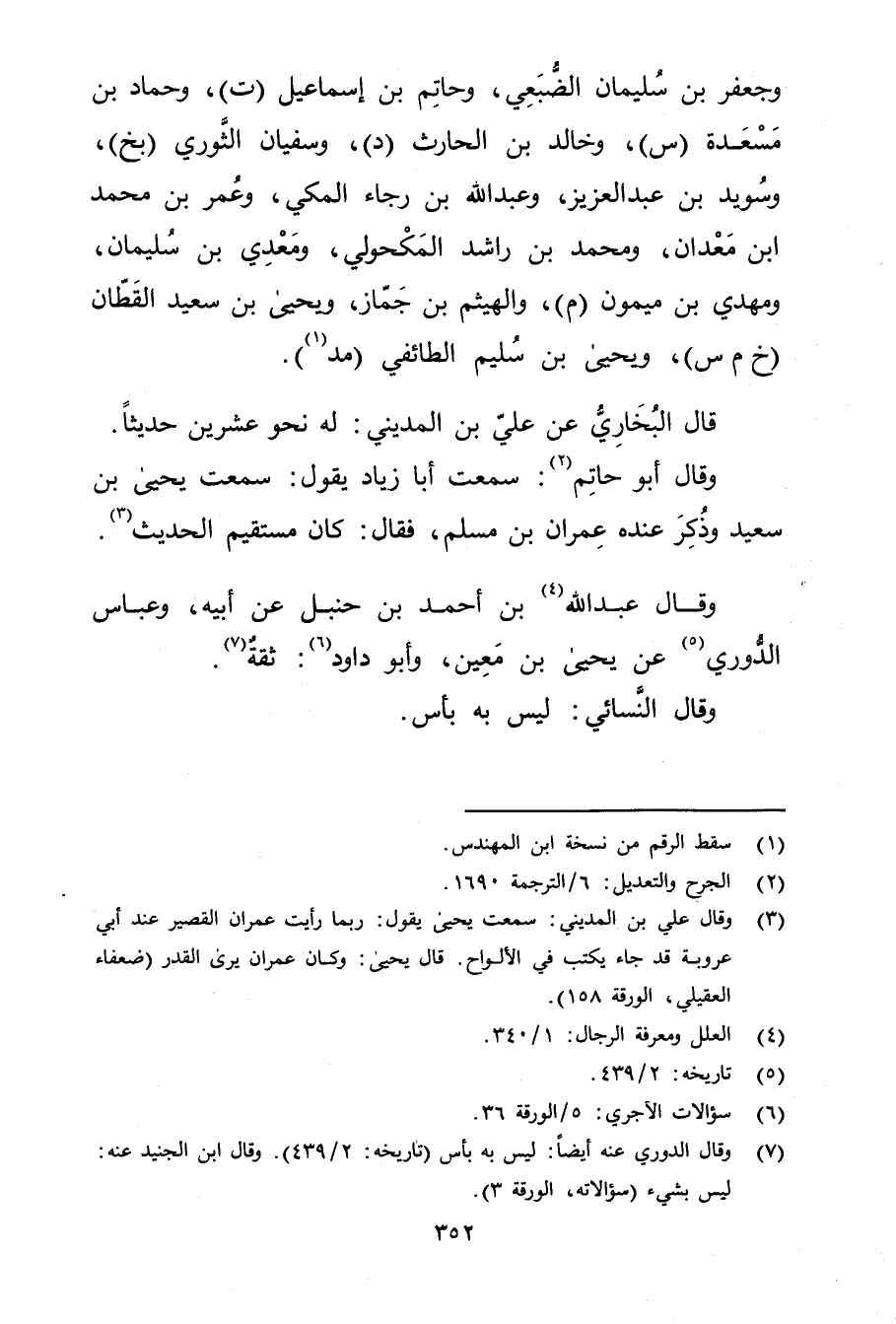 (7) وَقَال الدوري عنه أيضا: ليس به بأس (تاريخه: 2 / 439) . وَقَال ابن الجنيد عَنه: ليس بشيءٍ (سؤالاته، الورقة 3) .