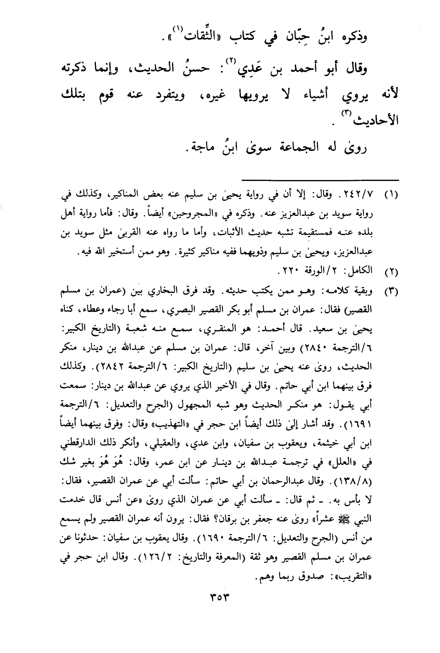 (3) وبقية كلامه: وهو ممن يكتب حديثه. وقد فرق البخاري بين (عِمْران بن مسلم القصير) فقال: عِمْران بن مسلم أبو بكر القصير البَصْرِيّ، سمع أبا رجاء وعطاء، كناه يحيى بن سَعِيد. قال أحمد: هو المنقري، سمع منه شعبة (التاريخ الكبير: 6 / الترجمة 2840) وبين آخر، قال: عِمْران بن مسلم عن عَبد الله بن دينار، منكر الحديث، روى عنه يحيى بن سليم (التاريخ الكبير: 6 / الترجمة 2842) . وكذلك فرق بينهما ابن أَبي حاتم. وَقَال في الاخير الذي يروي عن عَبد الله بن دينار: سمعت أبي يقول: هو منكر الحديث وهو شبه المجهول (الجرح والتعديل: 6 / الترجمة 1691) . وقد أشار إلى ذلك أيضا ابن حجر في "التهذيب "وَقَال: وفرق بينهما أيضا ابن أَبي خيثمة، ويعقوب بن سفيان، وابن عدي، والعقيلي، وأنكر ذلك الدارقطني في "العلل "في ترجمة عَبد الله بن دينار عن ابن عُمَر، وَقَال: هو هو بغير شك (8 / 138) . وَقَال عبد الرحمن بن أَبي حاتم: سَأَلتُ أبي عن عِمْران القصير، فقال: لا بأس به. - ثم قال: - سَأَلتُ أبي عن عِمْران الذي روى "عن أنس قال خدمت النبي صلى الله عليه وسلم عشرا "روى عنه جعفر بن برقان؟ فقال: يرون أنه عِمْران القصير ولم يسمع من أنس (الجرح والتعديل: 6 / الترجمة 1690) . وَقَال يعقوب بن سفيان: حدثونا عن عِمْران بن مسلم القصير وهو ثقة (المعرفة والتاريخ: 2 / 126) . وَقَال ابن حجر في "التقريب": صدوق ربما وهم.