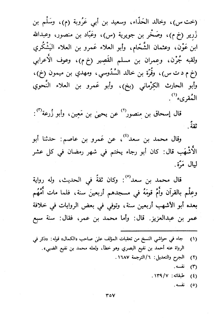 وَقَال مُحَمَّد بْن سعد (4) ، عن عَمْرو بن عاصم: حَدَّثَنَا أَبُو الأشهب قال: كان أَبُو رجاء يختم في شهر رمضان في كل عشر ليال مرة.