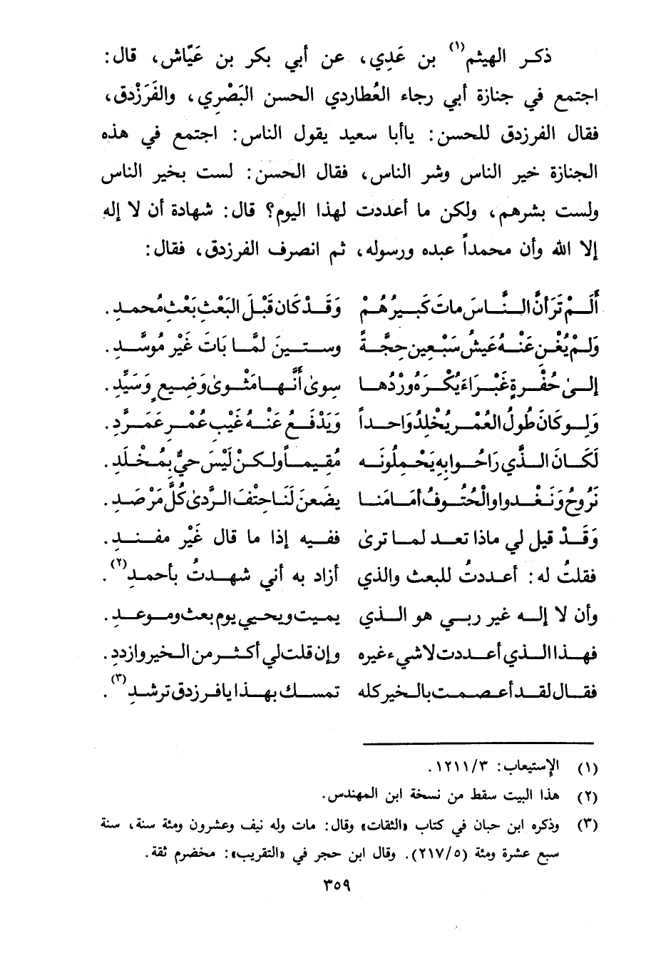 ذكر الهيثم (1) بْن عدي، عَن أَبِي بَكْرِ بْن عياش، قال: اجتمع في جنازة أَبِي رجاء العطاردي الحسن البَصْرِيّ، والفرزدق، فقال الفرزدق للحسن: يا أبا سَعِيد يقول الناس: اجتمع في هذه الجنازة خير الناس وشر الناس، فقال الحسن: لست بخير الناس ولست بشرهم، ولكن ما أعددت لهذا اليوم؟ قال: شهادة أن لا إِلَهَ إِلا اللَّهُ وأَنَّ محمدا عَبْده ورسوله، ثم انصرف الفرزدق، فقال: