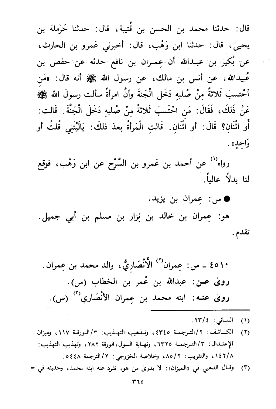 قال: حَدَّثَنَا مُحَمَّدُ بْنُ الْحَسَنِ بْنِ قُتَيْبَةَ، قال: حَدَّثَنَا حَرْمَلَةُ بْنُ يَحْيَى، قال: حَدَّثَنَا ابْنُ وهب، قال: أَخْبَرَنِي عَمْرو بْن الْحَارِثِ، عَنْ بُكَيْرِ بْنِ عَبد اللَّهِ أَنَّ عِمْران بْنَ نَافِعٍ حَدَّثَهُ عَنْ حَفْصِ بْنِ عُبَيد اللَّهِ، عَنْ أَنَسِ بْنِ مَالِكٍ، عن رَسُولِ اللَّهِ صَلَّى اللَّهُ عَلَيْهِ وسَلَّمَ أَنَّهُ قال: مَنْ احْتَسَبَ ثَلاثَةً مِنْ صُلْبِهِ دَخَلَ الْجَنَّةَ وأَنَّ امْرَأَةً سَأَلَتْ رَسُولَ اللَّهِ صلى الله عليه وسلم عَنْ ذَلِكَ، فَقَالَ: مَنِ احْتَسَبَ ثَلاثَةً مِنْ صُلْبِهِ دَخَلَ الْجَنَّةَ. قَالَتْ: أَوِ اثْنَانِ؟ قال: أَوِ اثْنَانِ.