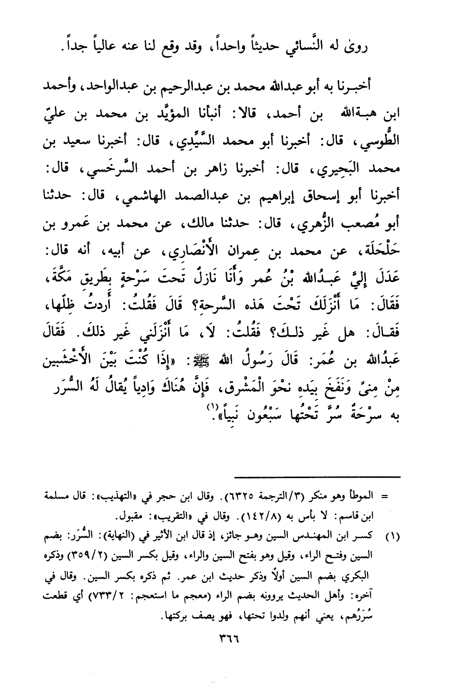 أَخْبَرَنَا بِهِ أَبُو عَبْدِ اللَّهِ مُحَمَّدُ بْنُ عَبد الرَّحِيمِ بْن عَبْد الواحد، وأحمد بْن هبة اللَّه بْن أَحْمَدَ، قَالا: أَنْبَأَنَا الْمُؤَيِّدُ بْنُ مُحَمَّدِ بْنِ عَلِيٍّ الطُّوسِيُّ، قال: أَخْبَرَنَا أَبُو مُحَمَّدٍ السَّيِّدِيُّ، قال: أَخْبَرَنَا سَعِيد بْنُ مُحَمَّدٍ الْبُحَيْرِيُّ، قال: أخبرنا زاهر بن أَحْمَد السرخسي، قال: أَخْبَرَنَا أبو إسحاق إِبْرَاهِيم بْن عبد الصمد الهاشمي، قال: حَدَّثَنَا أَبُو مُصْعَبٍ الزُّهْرِيّ، قال: حَدَّثَنَا مالك، عن مُحَمَّد بن عَمْرو بْن حلحلة، عَنْ مُحَمَّد بْن عِمْران الأَنْصارِيّ، عَن أَبِيهِ، أَنَّهُ قال: عدل إلي عَبد اللَّه بْن عُمَر وأنا نازل تحت سَرْحَةَ بِطَرِيقِ مَكَّةَ، فَقَالَ: مَا أَنْزَلَكَ تَحْتَ هَذِهِ السَّرْحَةِ؟ قال فَقُلْتُ: أَرَدْتُ ظِلَّهَا، فَقَالَ: هَلْ غَيْرَ ذَلِكَ؟ فَقُلْتُ: لا، مَا أَنْزَلَنِي غَيْرُ ذَلِكَ. فَقَالَ عَبد اللَّهِ بْنُ عُمَر: قال رَسُولُ اللَّهِ صلى الله عليه وسلم: "إذا كنت بين الاخشين مِنْ مِنَى ونَفَخَ بِيَدِهِ نَحْوَ الْمَشْرِقِ، فَإِنَّ هُنَاكَ وادِيًا يُقَالُ لَهُ السُّرَرُ بِهِ سَرْحَةٌ سُرَّ تحتها سبعون نبيا " (1) .
