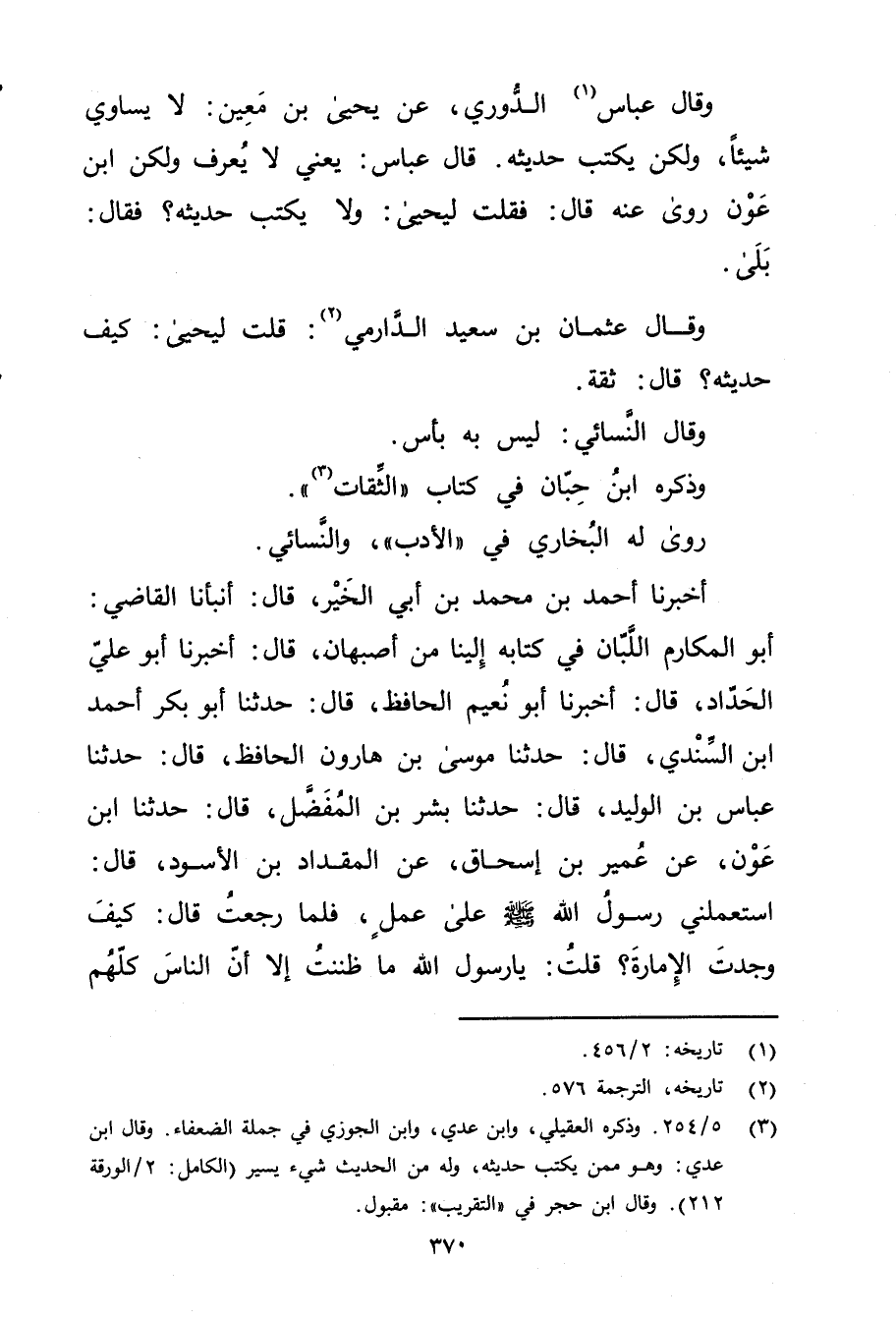 وَقَال عباس (1) الدوري، عَن يحيى بْن مَعِين: لا يساوي شيئا، ولكن يكتب حديثه. قال عباس: يعني لايعرف ولكن ابْن عون روى عنه قال: فقلت ليحيى: ولا يكتب حديثه؟ فقال: بلى.