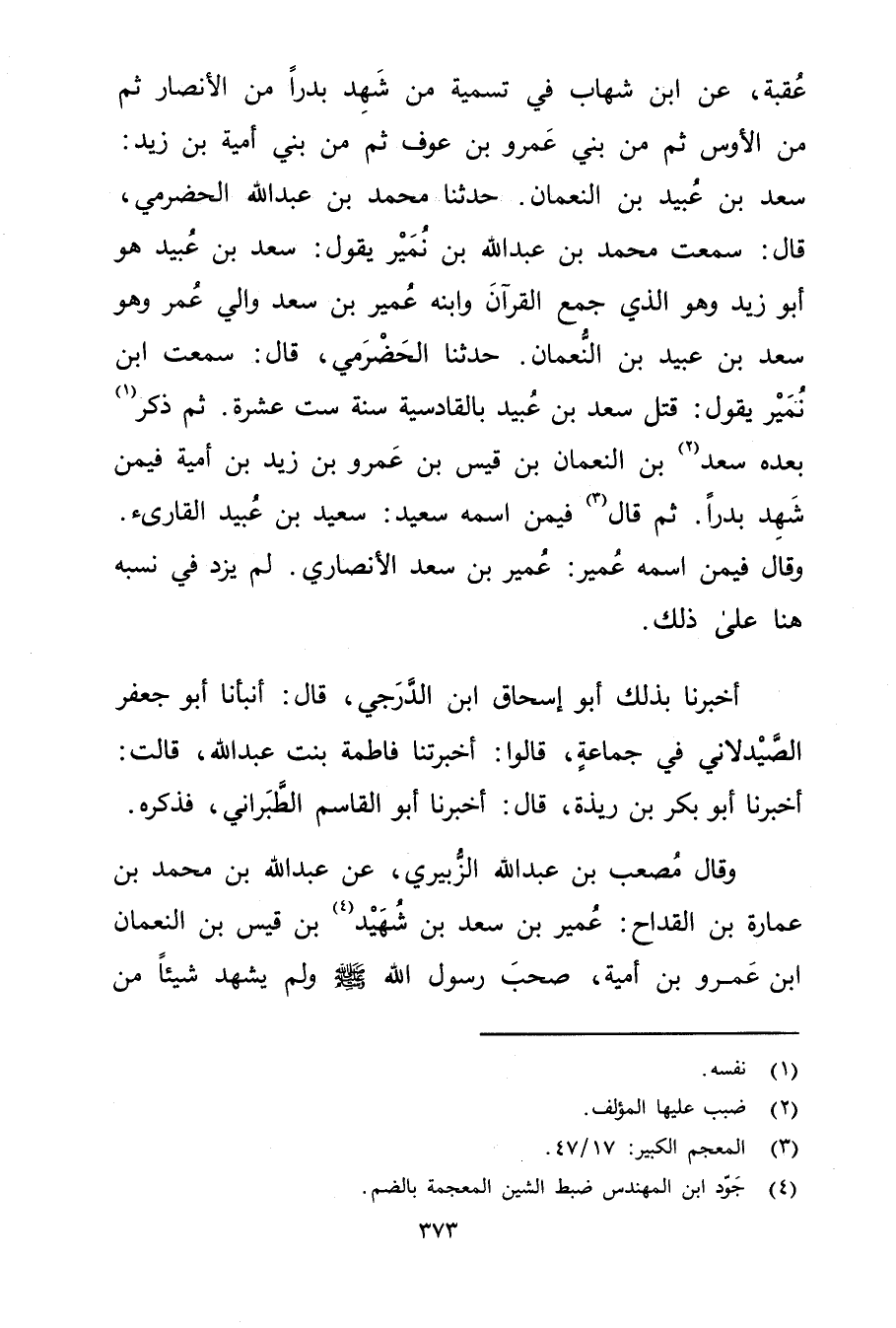 عقبة، عَنِ ابْن شهاب في تسمية من شهد بدرا من الأنصار ثم من الأوس ثم من بني عَمْرو بْن عوف ثم من بني أمية بْن زيد: سعد بْن عُبَيد بْن النعمان. حَدَّثَنَا مُحَمَّد بْن عَبد اللَّه الحضرمي، قال: سمعت مُحَمَّد بْن عَبد اللَّهِ بْن نمير يقول: سعد بْن عُبَيد هو أَبُو زيد وهو الذي جمع القرآن وابنه عُمَير بْن سعد والي عُمَر وهو سعد بْن عُبَيد بْن النعمان. حَدَّثَنَا الحضرمي، قال: سمعت ابْن نمير يقول: قتل سعد بْن عُبَيد بالقادسية سنة ست عشرة. ثم ذكره (1) بعده سعد (2) بْن النعمان بْن قَيْس بْن عَمْرو بْن زَيْد بْن أمية فيمن شهد بدرا. ثم قال (3) فيمن اسمه سَعِيد: سَعِيد بْن عُبَيد القارئ. وَقَال فيمن اسمه عُمَير: عُمَير بْن سعد الأَنْصارِيّ. لم يزد في نسبه هنا على ذلك.