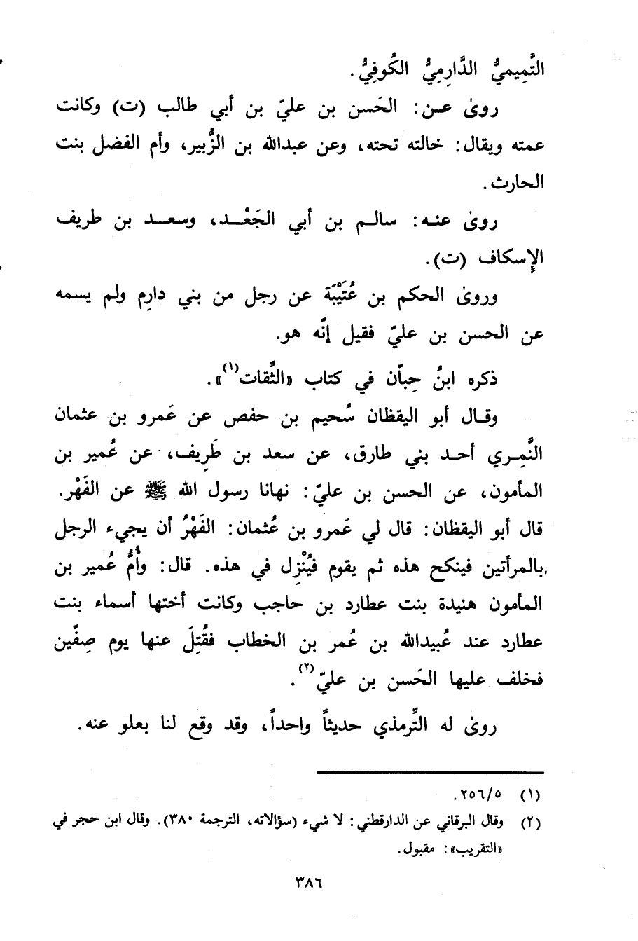 وَقَال أَبُو اليقظان سحيم بْن حفص عَنْ عَمْرو بْن عُثْمَان النمري أحد بني طارق، عَنْ سعد بْن طريف، عَنْ عُمَير بْن المأمون، عَنِ الحسن بْن عَلِيّ: نهانا رسول اللَّه صَلَّى اللَّهُ عَلَيْهِ وسَلَّمَ عَن الفهر. قال أَبُو اليقظان: قال لي عَمْرو بْن عُثْمَان: الفهر أن يجئ الرجل بالمرأتين فينكح هذه ثم يقوم فينزل في هذه. قال: وأم عُمَير بْن المأمون هنيدة بنت عطارد بْن حاجب وكانت أختها أسماء بنت عطارد عند عُبَيد اللَّهِ بْن عُمَر بْن الخطاب فقتل عنها يوم صفين فخلف عليها الحسن بْن عَلِيّ (2) .
