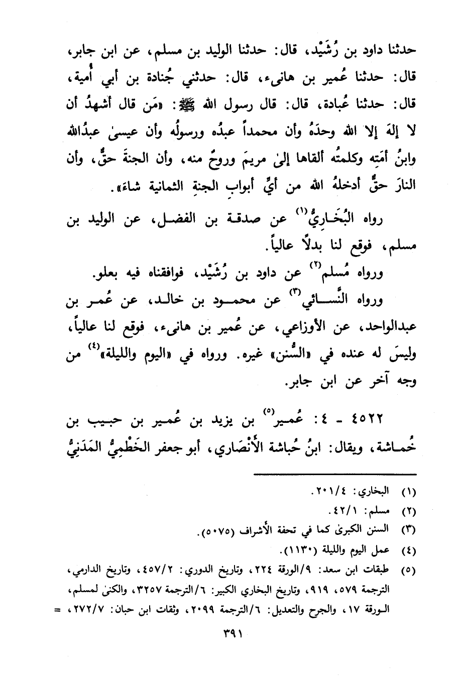 حَدَّثَنَا دَاوُدُ بْنُ رَشِيدٍ، قال: حَدَّثَنَا الْوَلِيدُ بْنُ مُسْلِمٍ، عَنْ ابْنِ جَابِرٍ، قال: حَدَّثَنَا عُمَير بْنُ هَانِئٍ، قال: حَدَّثَنِي جُنَادَةُ بْنُ أَبي أُمَيَّةَ، قال: حَدَّثَنَا عُبَادَةَ، قال: قال رَسُولُ اللَّهِ صلى الله عليه وسلم: "من قال أشهد أن لا إله إِلا اللَّهُ وحْدَهُ وأَنَّ مُحَمَّدًا عَبْدُهُ ورَسُولُهُ وأَنَّ عِيسَى عَبد اللَّهِ وابْنُ أَمَتِهِ وكَلِمَتُهُ أَلْقَاهَا إِلَى مَرْيَمَ ورُوحٌ مِنْهُ، وأَنَّ الْجَنَّةَ حَقٌّ، وأَنَّ النَّارَ حَقٌّ أَدْخَلَهُ اللَّهُ مِنْ أَيِ أَبْوَابِ الْجَنَّةِ الثَّمَانِيَةِ شَاءَ.