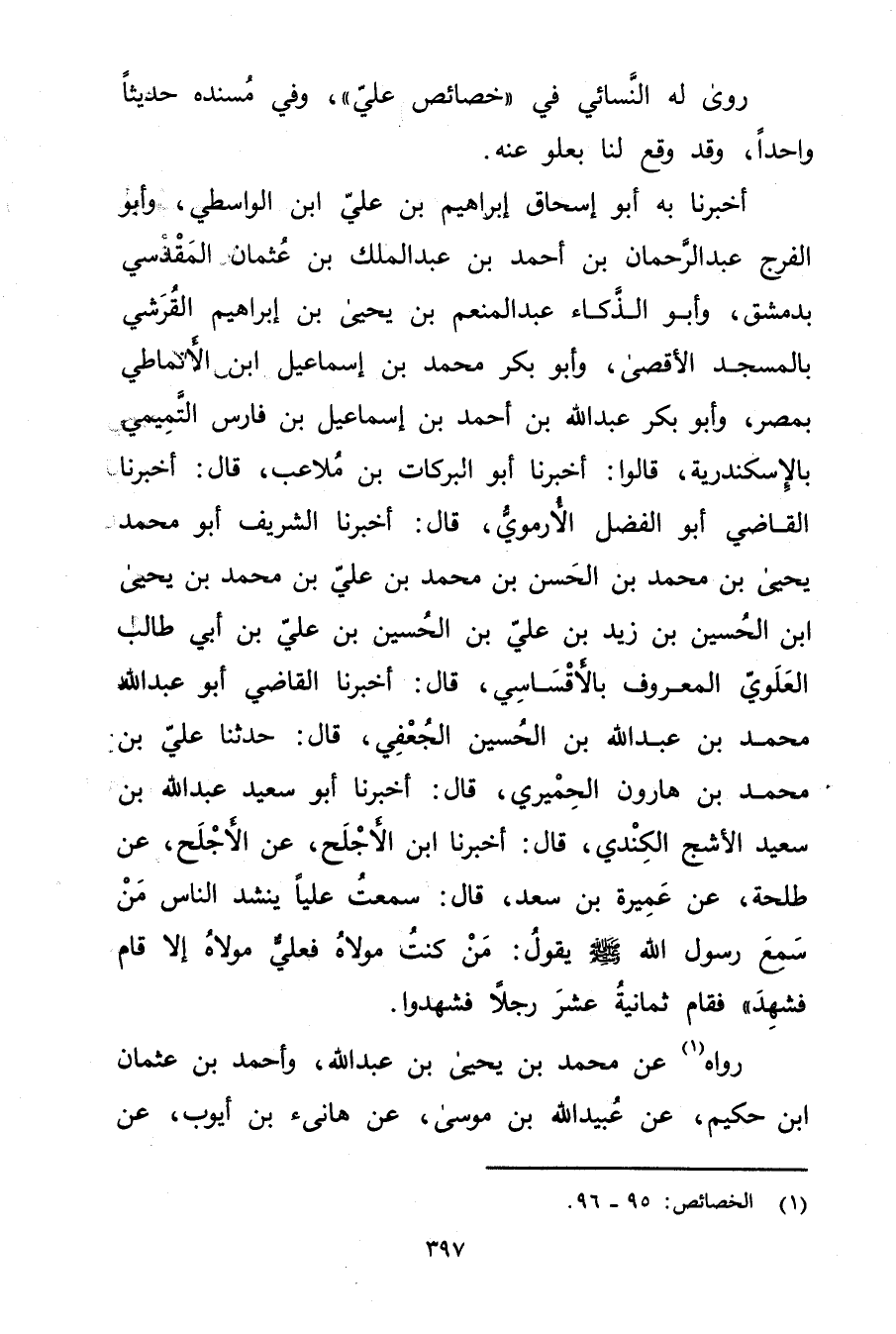 أَخْبَرَنَا بِهِ أَبُو إِسْحَاقَ إِبْرَاهِيمُ بْنُ علي ابْن الواسطي، وأبو الفرج عَبْد الرَّحْمَنِ بْنُ أَحْمَدَ بْنِ عَبد المَلِك بْنِ عُثْمَانَ الْمَقْدِسِيُّ بِدِمَشْقَ، وأَبُو الذكاء عَبْد المنعم بْن يَحْيَى بْنِ إِبْرَاهِيمَ الْقُرَشِيُّ بِالْمَسْجِدِ الأقصى، وأَبُو بَكْرٍ مُحَمَّدُ بْنُ إسماعيل ابن الأَنْمَاطِيِّ بِمِصْرَ، وأَبُو بَكْرٍ عَبد اللَّهِ بْن أَحْمَدَ بْنِ إِسْمَاعِيلَ بْن فارس التميمي بالإسكندرية، قَالُوا: أخبرنا أَبُو الْبَرَكَاتِ بْنُ مُلاعِبٍ، قال: أَخْبَرَنَا الْقَاضِي أَبُو الْفَضْلِ الأرموي، قال: أخبرنا الشريف أَبُو مُحَمَّد يحيى بْن مُحَمَّد بْن الْحَسَن بْن مُحَمَّد بْن عَلِيّ بن محمد بن يحيى ابن الحسين بن زيد بن عَلِيّ بْن الحسين بْن علي بْن أَبي طَالِبٍ الْعَلَوِيُّ الْمَعْرُوفُ بِالأَقْسَاسِيِّ قال:: أَخْبَرَنَا القاضي أَبُو عَبْد اللَّهِ مُحَمَّد بْن عَبد اللَّهِ بْنِ الْحُسَيْنِ الْجَعْفِيُّ، قال: حَدَّثَنَا عَلِيُّ بْنُ مُحَمَّدِ بْنِ هَارُونَ الْحِمْيَرِيُّ، قال: أَخْبَرَنَا أَبُو سَعِيد عَبد اللَّهِ بْن سَعِيد الأشج الْكِنْدِيُّ، قال: أَخْبَرَنَا ابْنُ الأَجْلَحِ، عَنِ الأَجْلَحِ، عَنْ طَلْحَةَ، عَنْ عُمَيْرَةَ بْنِ سَعْدٍ، قال: سَمِعْتُ عَلِيًّا يُنْشِدُ النَّاسَ مَنْ سَمِعَ رَسُول اللَّهِ صلى الله عليه وسَلَّمَ يَقُولُ: مَنْ كُنْتُ مَوْلاهُ فَعَلِيٌّ مَوْلاهُ إِلا قَامَ فَشَهِدَ "فَقَامَ ثَمَانِيَةُ عَشَرَ رَجُلا فَشَهِدُوا.