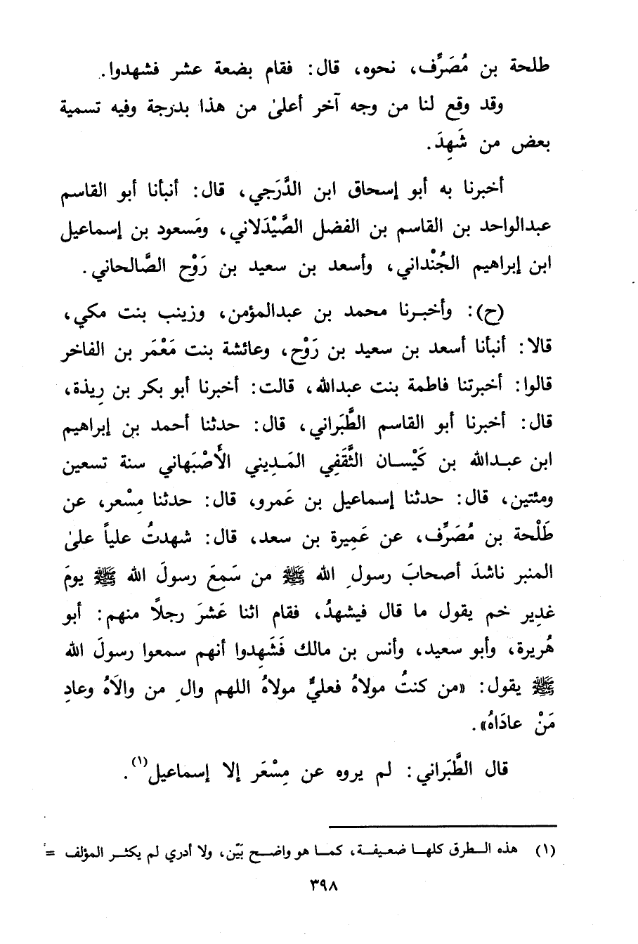 (ح) : وأَخْبَرَنَا محمد بن عبد المؤمن، وزَيْنَبُ بِنْتُ مَكِّيٍّ، قَالا: أَنَبَأَنَا أَسْعَدَ بْنِ سَعِيد بْنِ رَوْحٍ، وعَائِشَةُ بِنْتُ مَعْمَرِ بْنِ الْفَاخِرِ قَالُوا: أَخْبَرَتْنا فَاطِمَةُ بِنْتُ عَبد اللَّهِ، قَالَتْ: أخبرنا أَبُو بَكْرِ بْنِ رِيذَةَ، قال: أخبرنا أَبُو الْقَاسِمِ الطَّبَرَانِيُّ، قال: حَدَّثَنَا أَحْمَدُ بن إبراهيم ابن عَبد اللَّهِ بْنِ كَيْسَانَ الثَّقَفِيُّ المديني الأصبهاني سنة تسعين ومئتين، قال: حَدَّثَنَا إِسْمَاعِيلُ بْنُ عَمْرو، قال: حَدَّثَنَا مِسْعَرٌ، عَنْ طَلْحَةَ بْنِ مُصَرِّفٍ، عَنْ عُمَيْرَةَ بْنِ سَعْدٍ، قال: شَهِدْتُ عَلِيًّا عَلَى الْمِنْبَرِ نَاشَدَ أَصْحَابَ رَسُولِ اللَّهِ صلى الله عليه وسلم من سَمِعَ رَسُولَ اللَّهِ صَلَّى اللَّهُ عَلَيْهِ وسَلَّمَ يَوْمَ غَدِيرِ خَمٍّ يَقُولُ مَا قال فَيَشْهَدُ، فَقَامَ اثْنَا عَشَرَ رَجُلا مِنْهُمْ: أَبُو هُرَيْرة، وأَبُو سَعِيد، وأَنَسُ بْنُ مَالِكٍ فَشَهِدُوا أَنَّهُمْ سَمِعُوا رَسُولَ اللَّهِ صلى الله عليه وسلم يَقُولُ: "مَنْ كُنْتُ مَوْلاهُ فَعَلِيٌّ مَوْلاهُ اللَّهُمَّ والِ مَنْ والاهُ وعَادِ مَنْ عَادَاهُ.