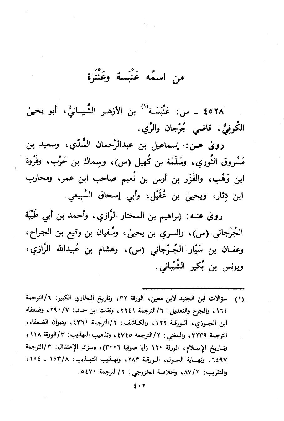 4528 - س: عنبسة بن الازهر الشيباني (1) ، أبويحيى الكوفي، قاضي جرجان والري.
