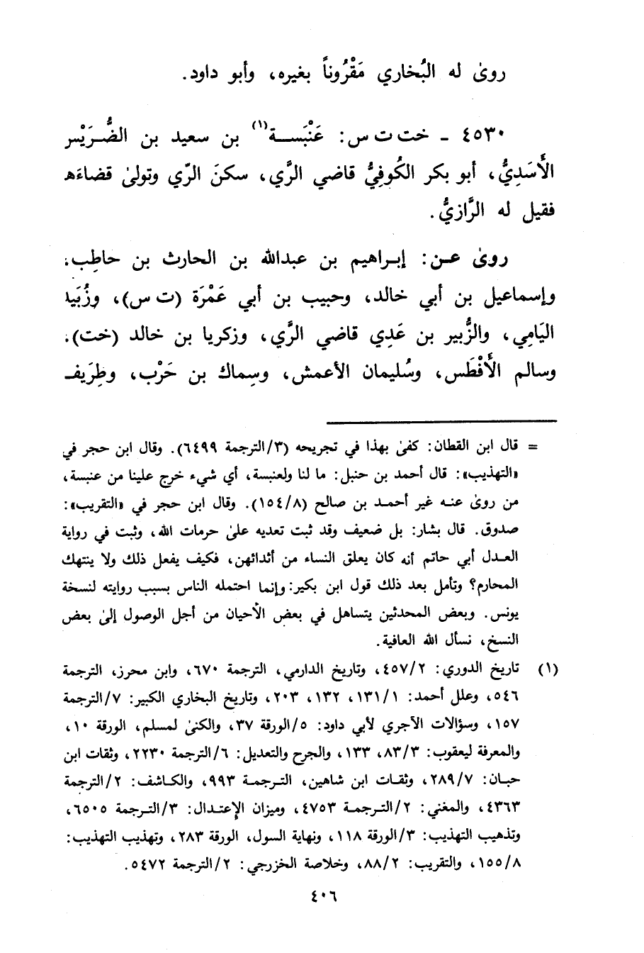 4530 - خت ت س: عنبسة بن سَعِيد بن الضرير الأسدي (1) ، أَبُو بكر الكوفي قاضي الري، سكن الري وتولى قضاءه فقيل له الرازي.