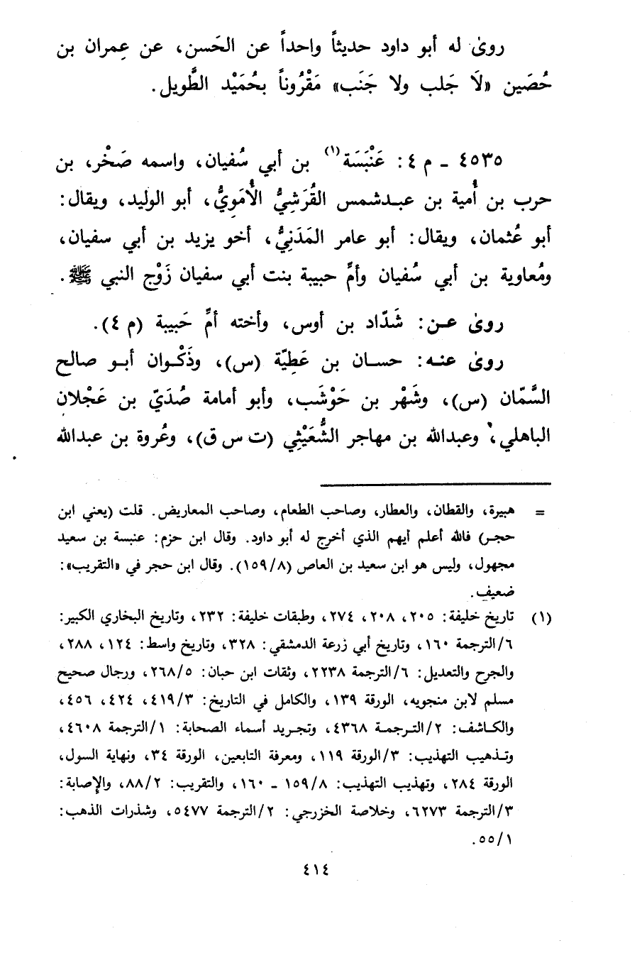 4535 - م 4: عنبسة بن أَبي سفيان (1) ، واسمه صخر، بن حرب بن أمية بن عبد شمس القرشي الأُمَوِي، أَبُو الوليد، ويُقال: أبو عثمان، ويُقال: أبو عامر المدني، أخو يزيد بْن أَبي سفيان، ومعاوية بْن أَبي سفيان وأم حبيبة بنت أَبِي سُفْيَان زوج النَّبِيّ صَلَّى اللَّهُ عليه وسلم.