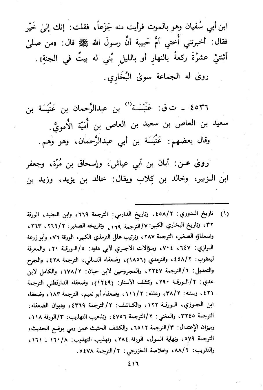 4536 - ت ق: عنبسة بن عَبْد الرحمن بن عنبسة بن سَعِيد بن العاص بن سَعِيد بن العاص بن أمية الأُمَوِي (1) .