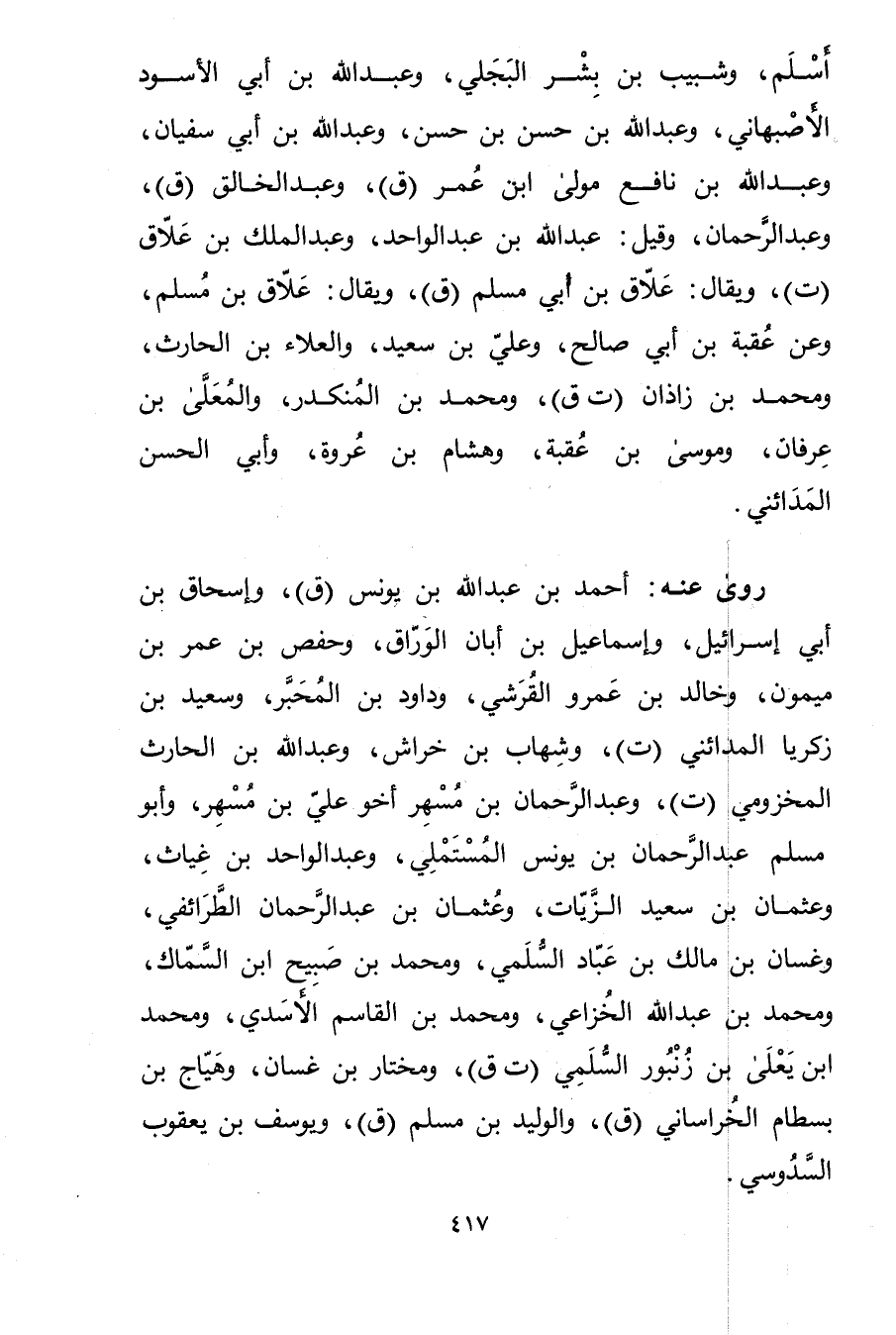 أسلم، وشيبب بْن بشر البجلي، وعَبْد اللَّه بْن أَبي الأسود الأصبهاني، وعَبْد الله بْن حسن بْن حسن، وعبد الله بْن أَبي سفيان، وعَبْد اللَّهِ بن نافع مولى ابْن عُمَر (ق) ، وعَبْد الخالق (ق) ، وعَبْد الرحمن، وقيل: عَبد اللَّه بْن عَبْد الواحد، وعَبْد الملك بْن علاق (ت) ، ويُقال: علاق بْن أَبي مسلم (ق) ، ويُقال: علاق بْن مسلم، وعن عقبة بْن أَبي صالح، وعلي بْن سَعِيد، والعلاء بْن الحارث، ومُحَمَّد بْن زاذان (ت ق) ، ومُحَمَّد بْن المنكدر، والمعلى بْن عرفان، وموسى بْن عقبة، وهشام بْن عروة، وأبي الحسن المدائني.