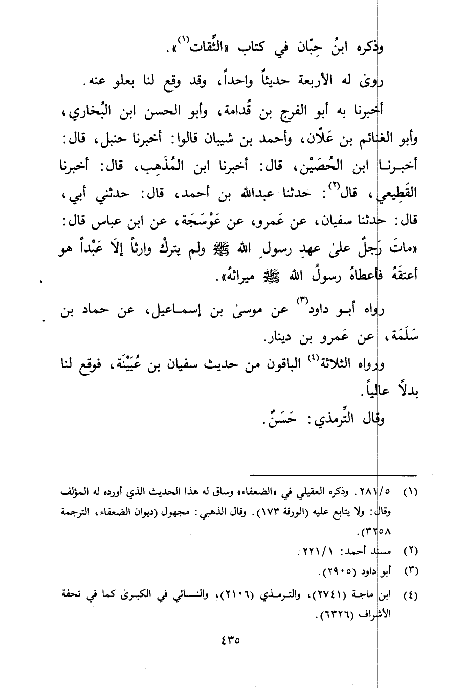 أَخْبَرَنَا به أَبُو الفرج بْنِ قُدَامَةَ، وأَبُو الْحَسَنِ بْنُ الْبُخَارِيِّ، وأَبُو الْغَنَائِمِ بْنُ عَلانَ، وأَحْمَدُ بْنُ شَيْبَانَ قَالُوا: أَخْبَرَنَا حنبل، قال: أخبرنا ابن الحصين، قال: أخبرنا ابْنُ الْمُذْهِب، قال: أخبرنا القَطِيعِيّ، قال (2) : حَدَّثَنَا عَبد اللَّهِ بْن أَحْمَدَ، قال: حَدَّثني أَبِي، قال: حَدَّثَنَا سُفْيَانُ، عَنْ عَمْرو، عَنْ عَوْسَجَةَ، عَنِ ابْنِ عَبَّاسٍ قال: مَاتَ رَجُلٌ عَلَى عَهْدِ رَسُولِ اللَّهِ صَلَّى اللَّهُ عَلَيْهِ وسَلَّمَ ولَمْ يَتْرُكْ وارِثًا إِلا عَبْدًا هُوَ أَعْتَقَهُ فَأَعْطَاهُ رَسُول اللَّهِ صلى الله عليه وسَلَّمَ مِيرَاثَهُ.
