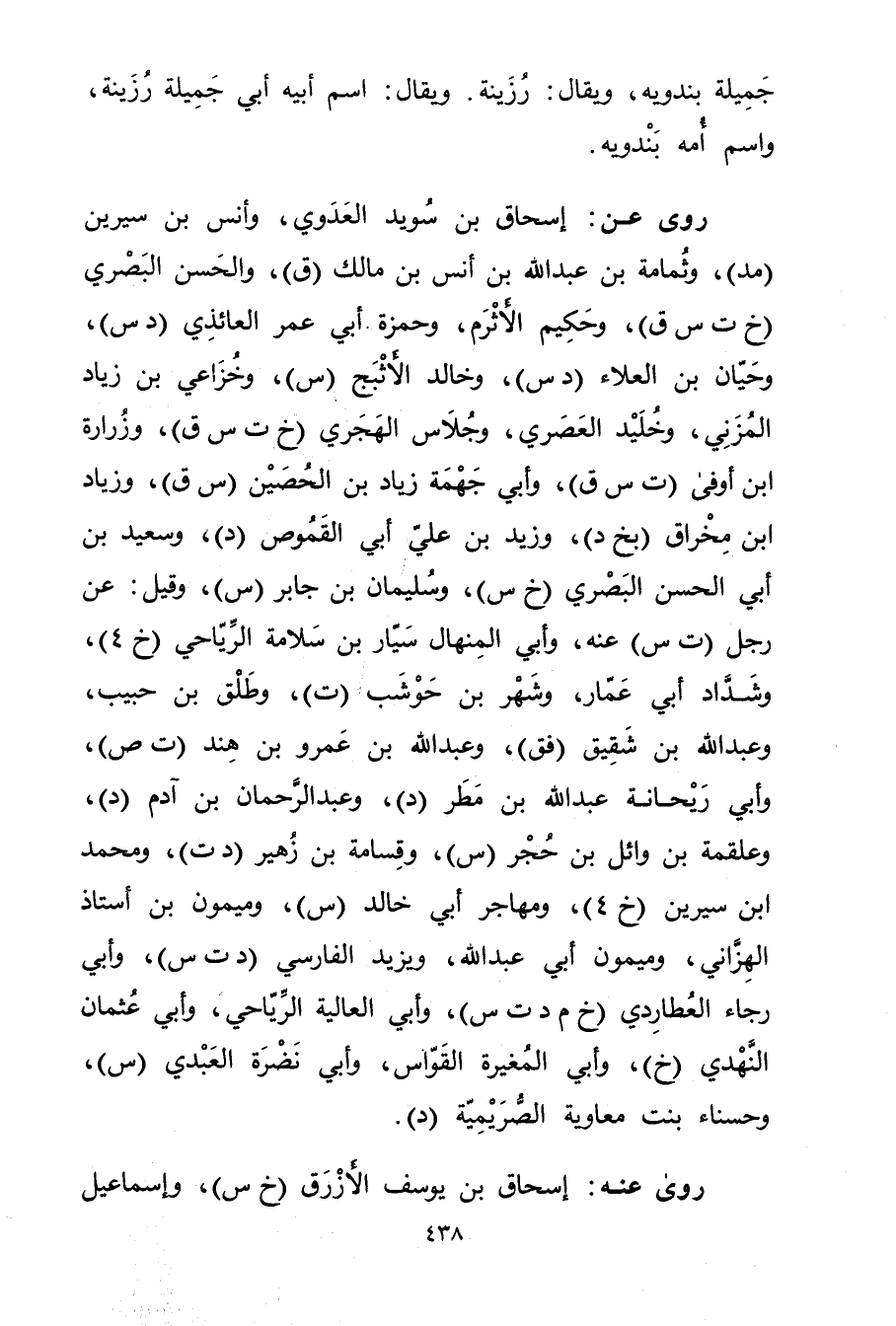 رَوَى عَن: إسحاق بْن سويد العدوي، وأنس بْن سيرين (مد) ، وثمامة بْن عَبد اللَّهِ بْن أنس بْن مالك (ق) ، والحسن البَصْرِيّ (خ ت س ق) ، وحكيم الأثرم، وحمزة أَبِي عُمَر العائذي (د س) ، وحيان بْن العلاء (د س) ، وخالد الأثبج (س) ، وخزاعي بْن زياد المزني، وخليد العصري، وجلاس الهجري (خ ت س ق) ، وزرارة ابن أوفى (ت س ق) ، وأبي جهمة زياد بْن الْحُصَيْن (س ق) ، وزياد ابن مخراق (بخ د) ، وزيد بْن علي أبي الصموص (د) ، وسَعِيد بْن أَبي الحسن البَصْرِيّ (خ س) ، وسُلَيْمان بْن جابر (س) ، وقيل: عَنْ رجل (ت س) عنه، وأبي المنهال سَيَّار بْن سلامة الرياحي (خ 4) ، وشداد أَبِي عمار، وشهر بْن حوشب (ت) ، وطلق بْن حبيب، وعَبْد اللَّه بْن شقيق (فق) ، وعَبْد اللَّهِ بن عَمْرو بن هند (ت ص) ، وأبي ريحانة عَبد اللَّهِ بن مطر (د) ، وعَبْد الرحمن بْن آدم (د) ، وعلقمة بْن وائل بْن حجر (س) ، وقسامة بن زهير (د ت) ، ومحمد ابن سيرين (خ 4) ، ومهاجر أَبِي خالد (س) ، وميمون بْن أستاذ الهزاني، وميمون أَبِي عَبد اللَّه، ويزيد الفارسي (د ت س) ، وأبي رجاء العطاردي (خ م د ت س) ، وأبي العالية الرياحي، وأبي عُثْمَان النهدي (خ) ، وأبي المغيرة القواس، وأبي نضرة العَبْدي (س) ، وحسناء بنت معاوية الصريمية (د) .