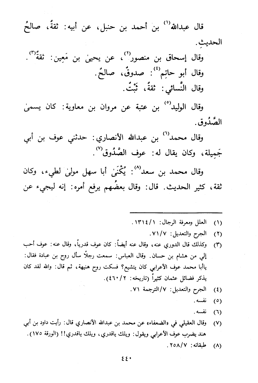 (7) وَقَال العقيلي في "الضعفاء "عَنْ مُحَمَّد بْن عَبد اللَّهِ الأَنْصارِيّ قال: رأيت داود بن أَبي هند يضرب عوف الاعرابي ويقول: ويلك يا قدري، ويلك يا قدري! ! (الورقة 175) .