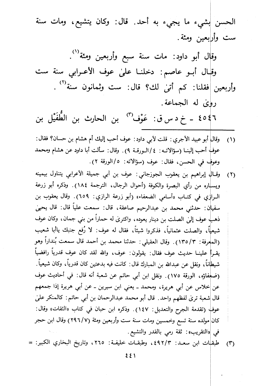 (2) وَقَال إِبْرَاهِيم بْن يعقوب الجوزجاني: عوف بن أَبي جميلة الأعرابي يتناول بيمينه ويساره من رأي البصرة والكوفة (أحوال الرجال، الترجمة 184) ، وذَكَره أبو زُرْعَة الرازي في كتاب "أسامي الضعفاء " (أبو زُرْعَة الرازي: 659) . وَقَال يعقوب بن سفيان: حدثني محمد بن عَبد الرحيم صاعقة، قال: سمعت عليا قال: قال يحيى ذهب عوف إلى الصلت بن دينار يعوده، واكترى له حمارا من بني جمان، وكان عوف شيعيا، والصلت عثمانيا، فذكروا شيئا، فقال له عوف: لا رفع جنبك يا أبا شعيب (المعرفة: 3 / 135) . وَقَال العقيلي: حَدَّثَنَا محمد بن احمد قال سمعت بندارا وهو يقرأ علينا حديث عوف فقال: يقولون: عوف، والله لقد كان عوف قدريا رافضيا شيطانا، ونقل عن عَبد الله بن المبارك قال: كانت فيه بدعتين كان قدريا، وكان شيعيا. (ضعفاؤه، الورقة 175) . ونقل ابن أَبي حاتم عن شعبة أنه قال: في أحاديث عوف عن خلاس عَن أبي هُرَيْرة، ومحمد، يعني ابن سيرين - عَن أبي هُرَيْرة إذا جمعهم قال شعبة ترى لفظهم واحد. قال أبو محمد عبد الرحمن بن أَبي حاتم: كالمنكر على عوف (تقدمة الجرح والتعديل: 147) ، وذَكَره ابنُ حِبَّان في كتاب "الثقات" وَقَال كان مولده سنة تسع وخمسين ومات سنة ست وأربعين ومئة (7 / 296) وَقَال ابن حجر في "التقريب": ثقة رمي بالقدر والتشيع.