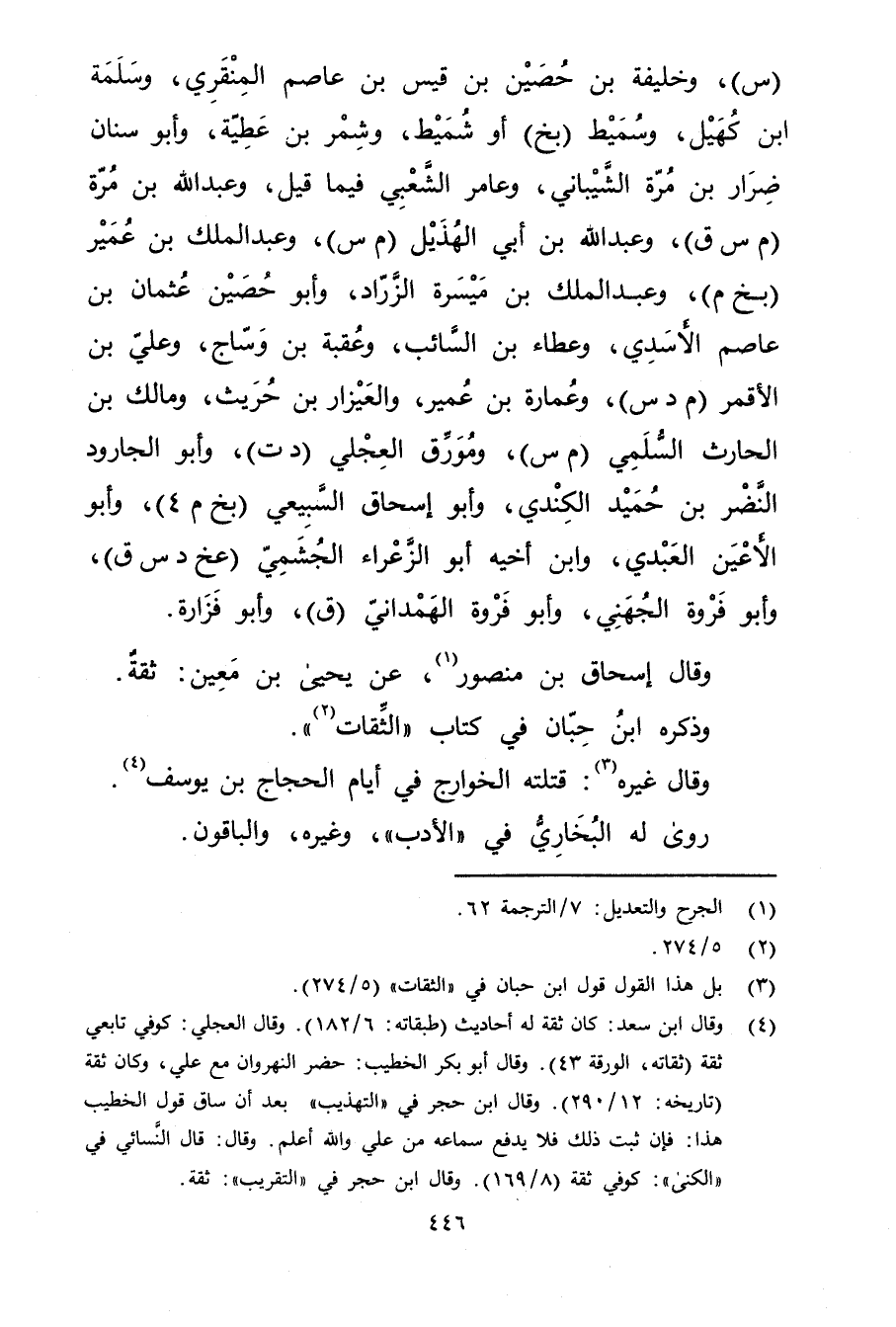 (4) وَقَال ابن سعد: كان ثقة له أحاديث (طبقاته: 6 / 182) . وَقَال العجلي: كوفي تابعي ثقة (ثقاته، الورقة 43) . وَقَال أبو بكر الخطيب: حضر النهروان مع علي، وكان ثقة (تاريخه: 12 / 290) . وَقَال ابن حجر في "التهذيب "بعد أن ساق قول الخطيب هذا: فإن ثبت ذلك فلا يدفع سماعه من علي والله أعلم. وَقَال: قال النَّسَائي في "الكنى ": كوفي ثقة (8 / 169) . وَقَال ابن حجر في "التقريب": ثقة.