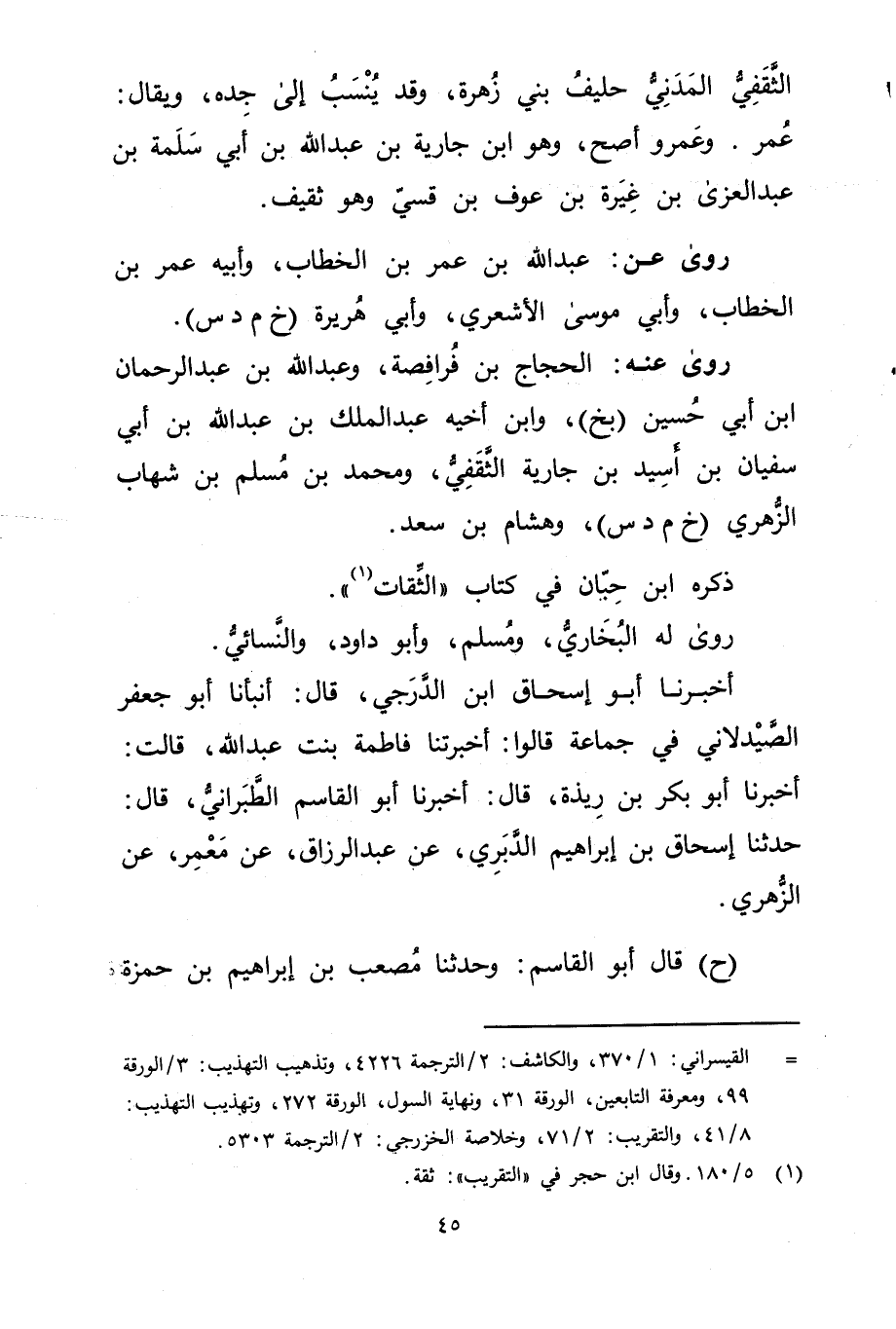 = القيسراني: 1 / 370، والكاشف: 2 / الترجمة 4226، وتذهيب التهذيب: 3 / الورقة 99، ومعرفة التابعين، الورقة 31، ونهاية السول، الورقة 272، وتهذيب التهذيب: