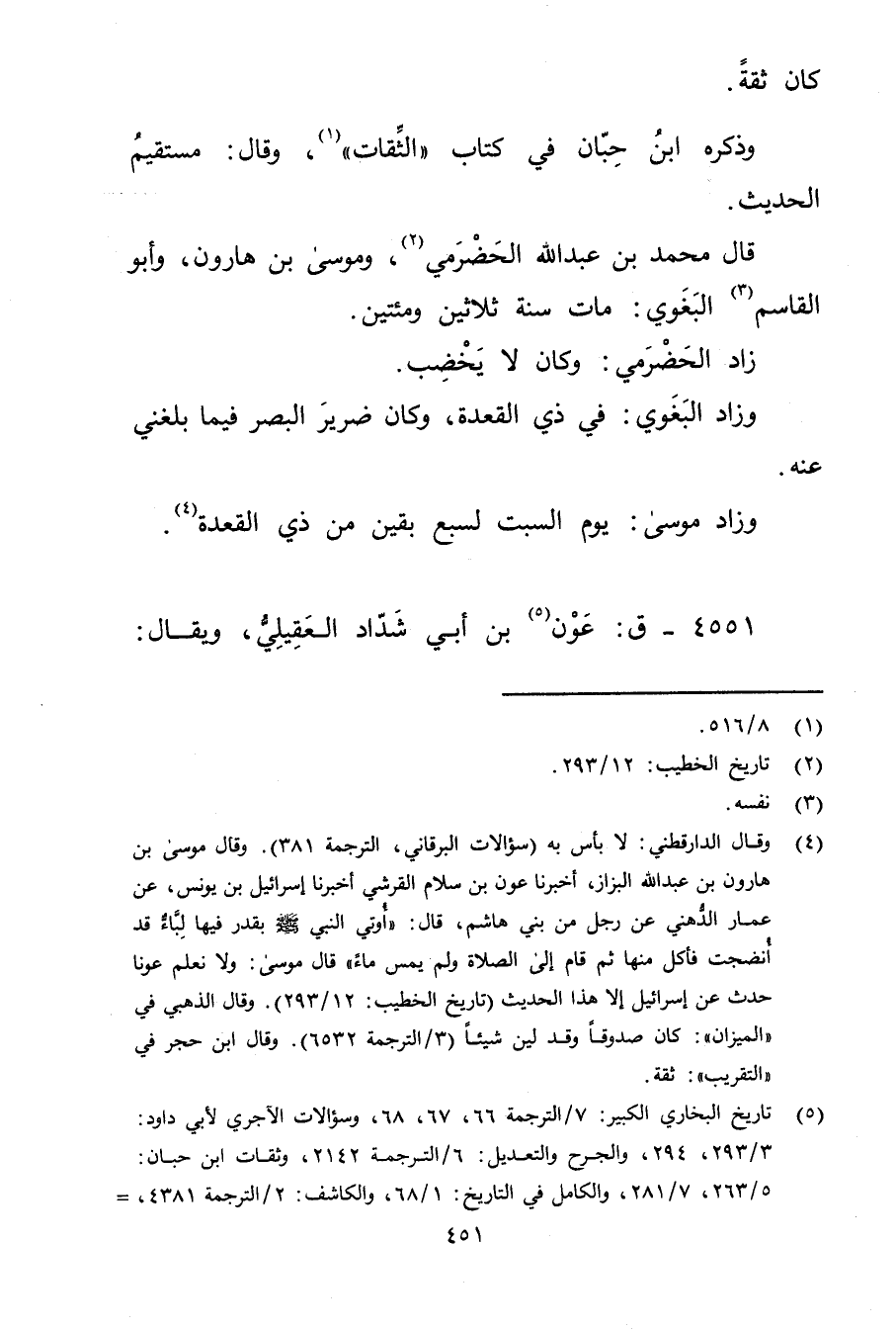 (5) تاريخ البخاري الكبير: 7 / الترجمة 66، 67، 68، وسؤالات الآجري لابي داود: 3 / 293، 294، والجرح والتعديل: 6 / الترجمة 2142، وثقات ابن حبان: 5 / 263، 7 / 281، والكامل في التاريخ: 1 / 68، والكاشف: 2 / الترجمة 4381، =