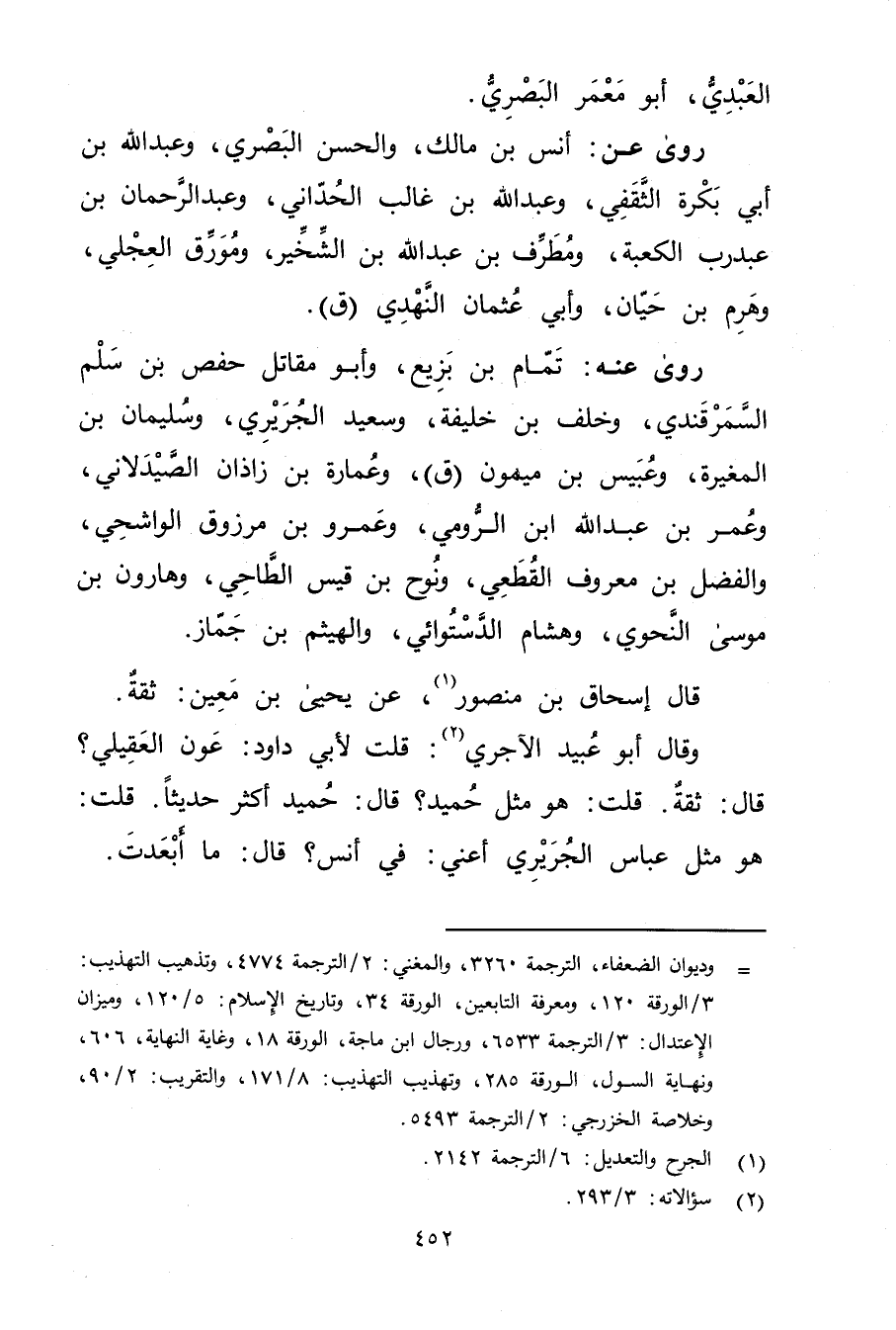 = وديوان الضعفاء، الترجمة 3260، والمغني: 2 / الترجمة 4774، وتذهيب التهذيب: 3 / الورقة 120، ومعرفة التابعين، الورقة 34، وتاريخ الاسلام: 5 / 120، وميزان الاعتدال: 3 / الترجمة 6523، ورجال ابن ماجة، الورقة 18، وغاية النهاية، 606، ونهاية السول، الورقة 285، وتهذيب التهذيب: 8 / 171، والتقريب: 2 / 90، وخلاصة الخزرجي: 2 / الترجمة 5493.