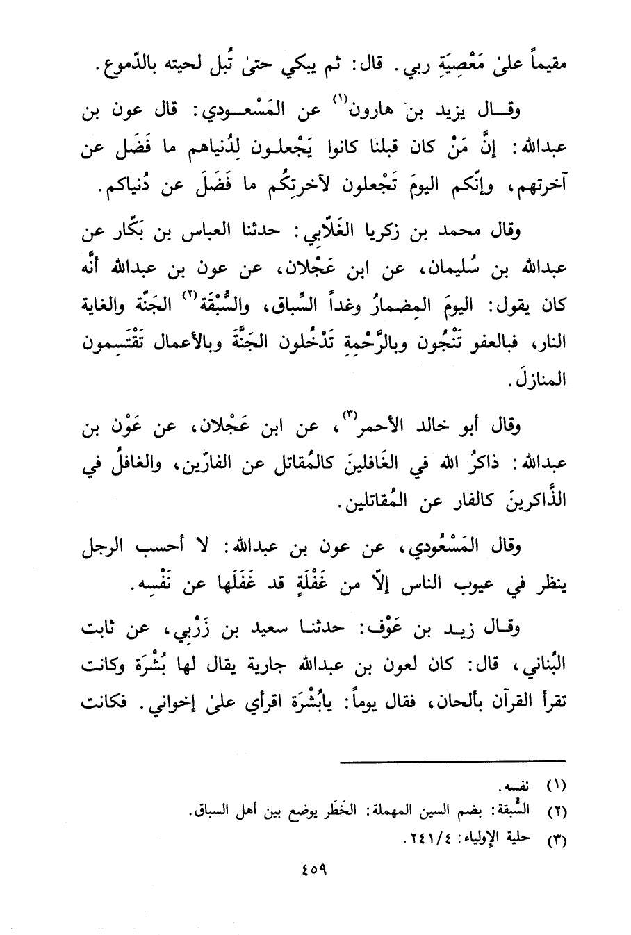 وَقَال مُحَمَّد بْن زكريا الغلابي: حَدَّثَنَا العباس بْن بكار عن عَبد اللَّهِ بْنِ سُلَيْمان، عَنِ ابْن عجلان، عَنْ عون بْن عَبد اللَّهِ أنه كَانَ يقول: اليوم المضمار وغدا السباق، والسبقة (2) الجنة والغاية النار، فبالعفو تنجون وبالرحمة تدخلون الجنة وبالأعمال تقتسمون المنازل.