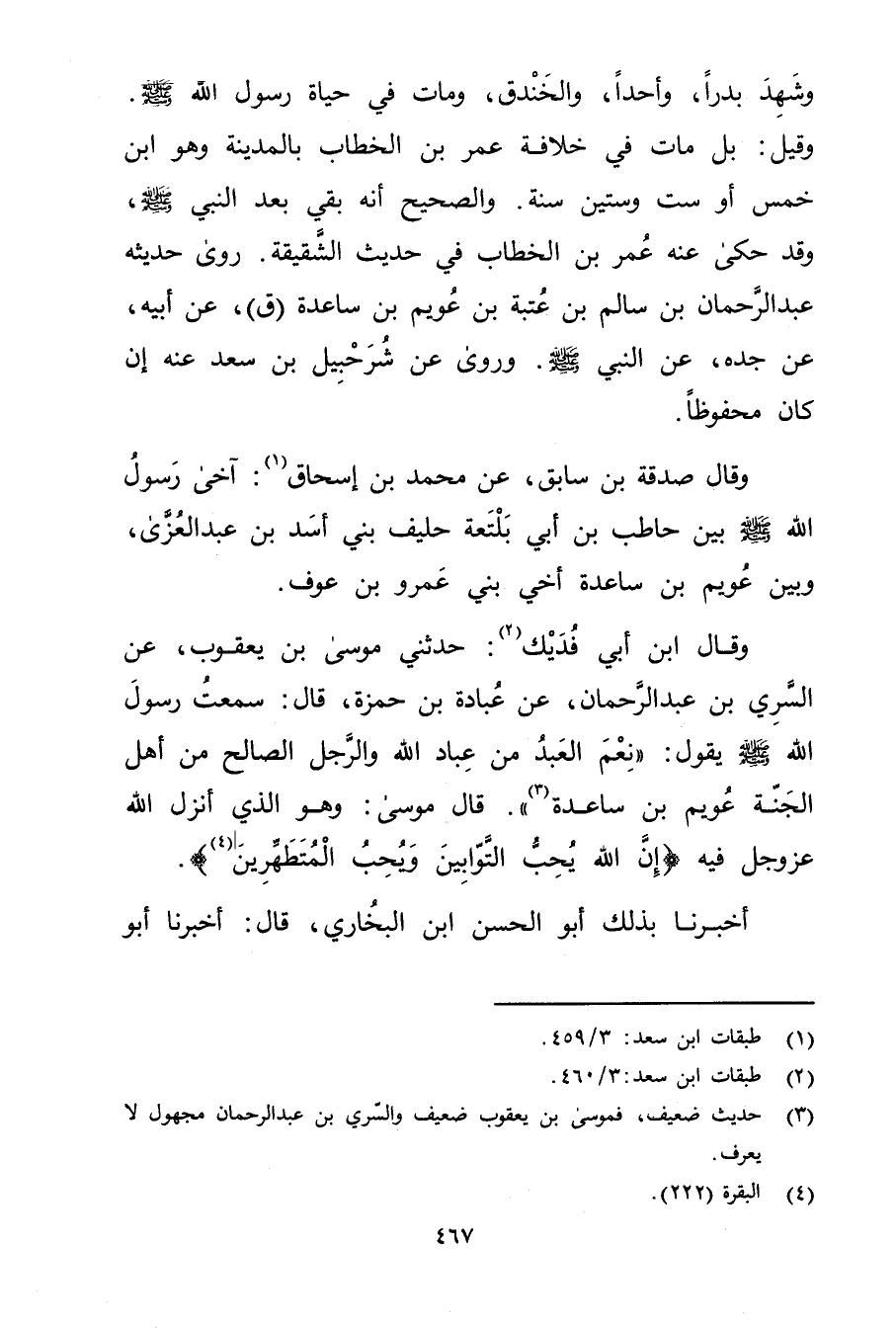 وَقَال ابْنُ أَبي فُدَيْكٍ (2) : حَدَّثَنِي مُوسَى بْنُ يَعْقُوبَ، عَنِ السَّرِيِّ بْنِ عَبْدِ الرَّحْمَنِ، عَنْ عُبَادَةَ بْنِ حَمْزَةَ، قال: سَمِعْتُ رَسُولَ اللَّهِ صَلَّى اللَّهُ عَلَيْهِ وسَلَّمَ يقول: "نِعْمَ الْعَبْدُ مَنْ عِبَادِ اللَّهِ والرَّجُلُ الصَّالِحُ مِنْ أَهْلِ الْجَنَّةِ عُوَيْمُ بْنُ سَاعِدَةَ (3) ". قال مُوسَى: وهو الذي أنزل الله عزوجل فِيهِ {إِنَّ اللَّهَ يُحِبُّ التَّوَّابِينَ ويُحِبُّ الْمُتَطَهِّرِينَ (4} .