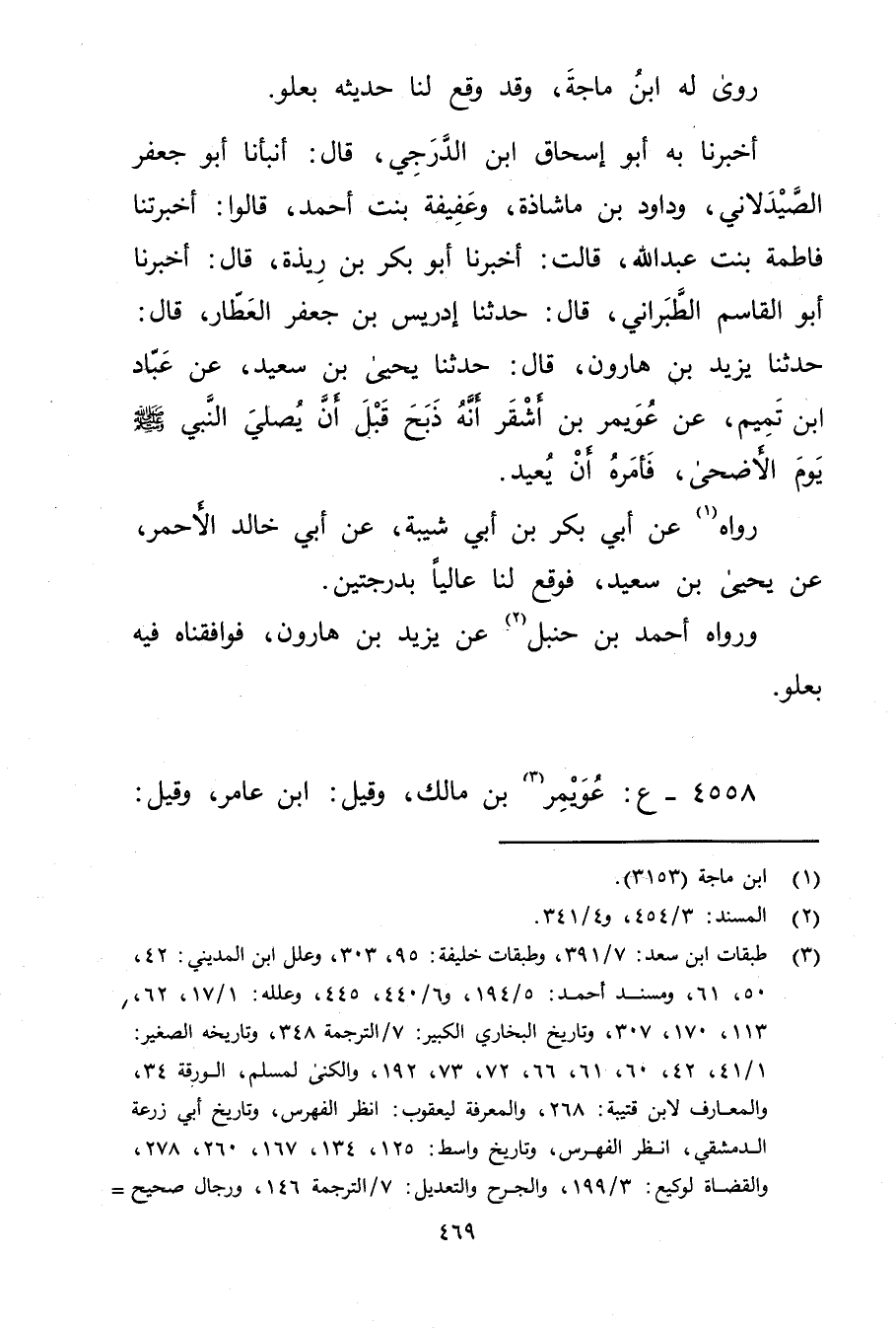 أخبرنا بِهِ أَبُو إِسْحَاقَ ابْنُ الدَّرَجِيِّ، قال: أنبأنا أَبُو جَعْفَرٍ الصَّيْدَلانِيُّ، ودَاوُدُ بْنُ مَاشَاذَةَ، وعَفِيفَةُ بِنْتُ أحمد، قَالُوا: أخبرتنا فاطمة بْنت عَبد اللَّهِ، قَالَتْ: أخبرنا أَبُو بَكْرِ بْنُ رِيذَةَ، قال: أخبرنا أَبُو الْقَاسِمِ الطَّبَرَانِيُّ، قال: حَدَّثَنَا إِدْرِيسُ بْنُ جَعْفَرٍ الْعَطَّارُ، قال: حَدَّثَنَا يزيد بْن هارون، قال: حَدَّثَنَا يَحْيَى بْنُ سَعِيد، عن عباد ابن تَمِيمٍ، عَنْ عُوَيْمَرِ بْنِ أَشْقَرَ أَنَّهُ ذَبَحَ قَبْلَ أَنْ يُصَلِّي النَّبِيُّ صلى الله عليه وسلم يَوْمَ الأَضْحَى، فَأَمَرَهُ أَنْ يُعِيدَ.