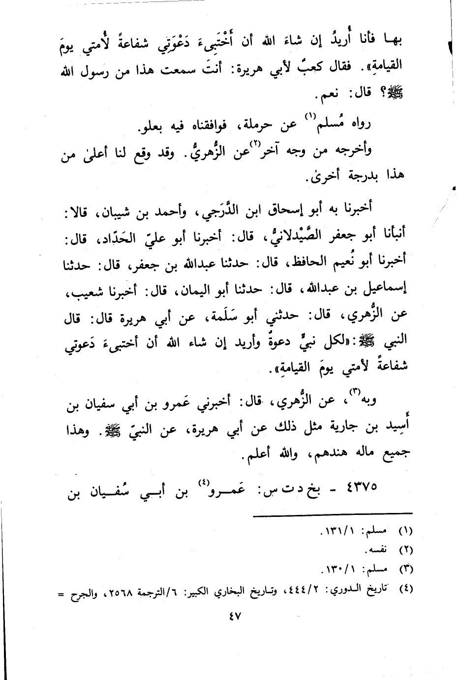 أَخْبَرَنَا بِهِ أَبُو إِسْحَاقَ ابْنُ الدَّرَجِيِّ، وأَحْمَدُ بْنُ شَيْبَانَ، قالا: أَنْبَأَنَا أَبُو جَعْفَرٍ الصَّيْدَلانِيُّ، قال: أَخْبَرَنَا أَبُو عَلِيّ الحداد، قال: أَخْبَرَنَا أبو نعيم الحافظ، قال: حَدَّثَنَا عَبد الله بْن جعفر، قال: حَدَّثَنَا إسماعيل بْن عَبد اللَّهِ، قال: حَدَّثَنَا أَبُو الْيَمَانِ، قال: أَخْبَرَنَا شُعَيْبٌ، عَنِ الزُّهْرِيّ، قال: حَدَّثَنِي أَبُو سَلَمَةَ، عَن أَبِي هُرَيْرة قال: قال النَّبِيُّ صَلَّى اللَّهُ عَلَيْهِ وسَلَّمَ: "لكل نَبِيٍّ دَعْوَةٌ وأُرِيدُ إِنْ شَاءَ اللَّهُ أَنْ أَخْتَبِئَ دَعْوَتِي شَفَاعَةً لأُمَّتِي يَوْمَ الْقِيَامَةِ.