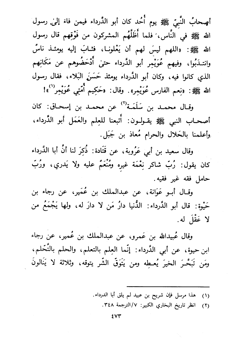 أصحاب النَّبِيّ صَلَّى اللَّهُ عليه وسلم يوم أحد كان أَبُو الدرداء فيمن فاء إلى رسول اللَّهِ صلى الله عليه وسلم في الناس، فلما أظلهم المشركون في فوقهم قال رسول اللَّه صَلَّى اللَّهُ عليه وسلم: "اللَّهم ليس لهم أن يعلونا، فثات إليه يومئذ ناس وانتدبوا، وفيهم عويمر أَبُو الدرداء حتى أدحضوهم عَنْ مكانهم الذي كانوا فيه، وكان أَبُو الدرداء يومئذ حسن البلاء، فقال رسول اللَّه صَلَّى اللَّهُ عليه وسلم: "نعم الفارس عويمر ". وَقَال: "حَكِيم أمتي عويمر (1) "!