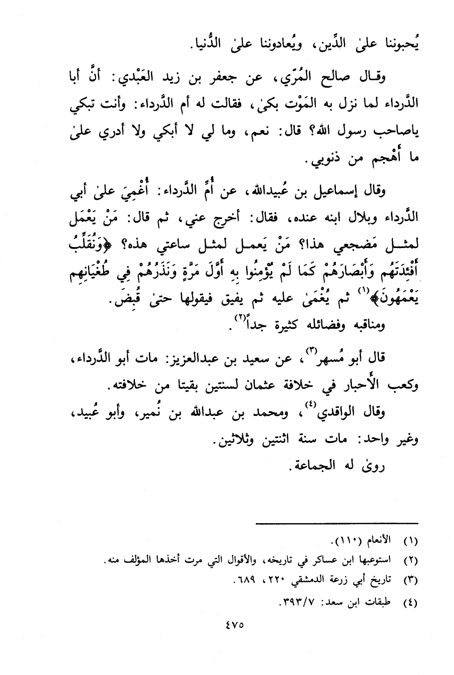 وَقَال إسماعيل بْن عُبَيد اللَّه، عَنْ أم الدرداء: أغمي على أَبي الدَّرْدَاء وبلال ابنه عنده، فال: أخرج عني، ثم قال: من يعمل لمثل مضجعي هذا؟ من يعمل لمثل ساعتي هذه؟ {ونقلب أفئدتهم وأبصارهم كما لم يؤمنوا به أول مرة ونذرهم في طغيانهم يعمهون) {1) ثم يغمى عليه ثم يفيق فيقولها حتى قبض.