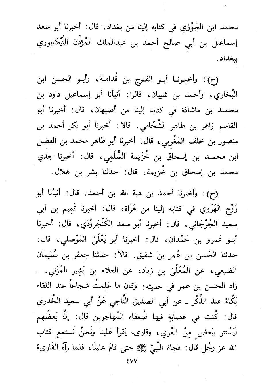 (ح) : وأَخْبَرَنَا أَحْمَدُ بْنُ هِبَةِ اللَّهِ بْنِ أَحْمَدَ، قال: أَنْبَأَنَا أَبُو رَوْحٍ الْهَرَوِيُّ فِي كِتَابِهِ إِلَيْنَا مِنْ هَرَاةَ، قال: أَخْبَرَنَا تَمِيمُ بْنُ أَبي سَعِيد الْجُرْجَانِيُّ، قال: أخبرنا أَبُو سَعْدٍ الْكَنْجَرُوذِيُّ، قال: أخبرنا أَبُو عَمْرو بْنُ حَمْدَانَ، قال: أخبرنا أَبُو يَعْلَى الموصلي، قال حَدَّثَنَا الْحَسَنُ بْنُ عُمَر بْنِ شَقِيقٍ. قَالا: حَدَّثَنَا جَعْفَرُ بْنُ سُلَيْمان الضَّبْعِيُّ، عَنِ الْمُعَلَّى بْنِ زِيَادٍ، عَنِ الْعَلاءِ بْنِ بَشِيرٍ الْمُزَنِيِّ. - زَادَ الْحَسَنُ بْنُ عُمَر فِي حَدِيثِهِ: وكَانَ مَا عَلِمْتُ شُجَاعًا عِنْدَ اللِّقَاءِ بَكَّاءً عِنْدَ الذِّكْرِ - عَن أَبِي الصِّدِّيقِ النَّاجِي عَن أَبِي سَعِيد الخُدْرِيّ قال: كُنْتُ فِي عِصَابَةٍ فِيهَا ضُعَفَاءُ الْمُهَاجِرِينَ قال: إِنَّ بَعْضَهُمْ لَيَسْتَتِرُ بِبَعْضٍ مِنَ الْعِرْيِ، وقَارِئٌ يَقْرَأُ عَلَيْنَا ونَحْنُ نَسْتَمِعُ كِتَابَ الله عزوجل قال: فَجَاءَ النَّبِيُّ صَلَّى اللَّهُ عَلَيْهِ وَسَلَّمَ حَتَّى قَامَ عَلَيْنَا، فَلَمَّا رَآهُ الْقَارِئُ