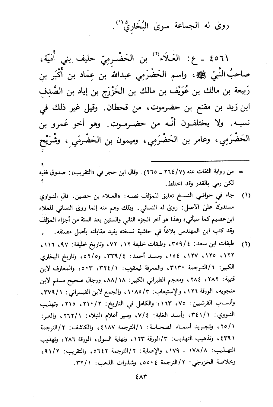 4561 - ع: العلاء بن الحضرمي حليف بني أمية (2) ، صاحب النبي صَلَّى اللَّهُ عَلَيْهِ وسَلَّمَ، واسم الحضرمي عَبد اللَّهِ بْن عماد بْن أكبر بْن ربيعة بْن مالك بْن عويف بْن مالك بْن الخزرج بْن اياد بْن الصدف ابن زيد بْن مقنع بْن حضرموت، من قحطان.