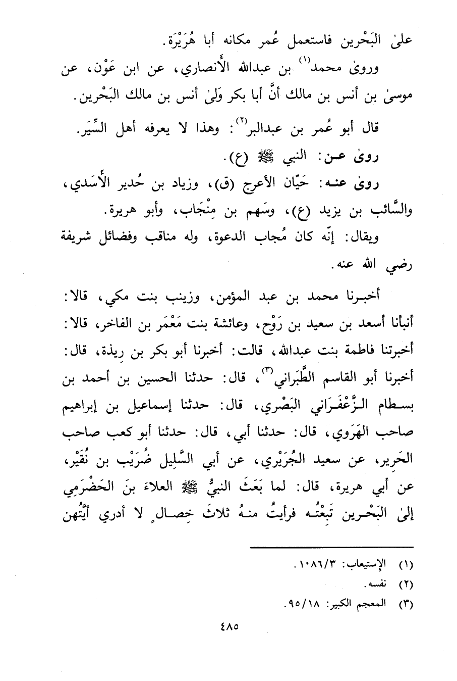 أخبرنا محمد بن عبد المؤمن، وزَيْنَبُ بِنْتُ مَكِّيٍّ، قَالا: أَنَبَأَنَا أَسْعَدَ بْنِ سَعِيد بْنِ رَوْحٍ، وعَائِشَةُ بِنْتُ مَعْمَرِ بْنِ الْفَاخِرِ، قَالا: أخَبْرَتْنَا فَاطِمَةُ بِنْتُ عَبد اللَّهِ، قَالَتْ أخبرنا أَبُو بَكْرِ بْنِ رِيذَةَ، قال: أخبرنا أَبُو الْقَاسِم الطبراني (3) ، قال: حَدَّثَنَا الحسين بْن أحمد بْن بسطام الزعفراني البَصْرِيّ، قال: حَدَّثَنَا إِسْمَاعِيلُ بْنُ إِبْرَاهِيمَ صَاحِبُ الْهَرَوِيِّ، قال: حَدَّثَنَا أَبِي، قال: حَدَّثَنَا أَبُو كَعْبٍ صَاحِبُ الْحَرِيرِ، عَنْ سَعِيد الْجَرِيرِيِّ، عَن أَبِي السَّلِيلِ، ضُرَيْبِ بْنِ نُقَيْرٍ، عَن أَبِي هُرَيْرة، قال: لَمَّا بَعَثَ النَّبِيُّ صَلَّى اللَّهُ عَلَيْهِ وسَلَّمَ الْعَلاءَ بْنَ الْحَضْرَمِيِّ