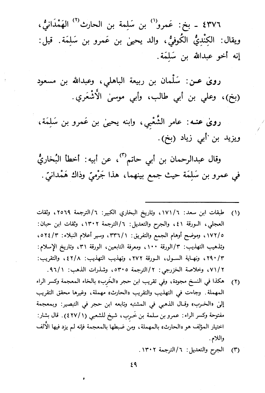 وجاءت في التهذيب والتقريب "الحارث "مهملة، وغيرها محقق التقريب إلى "الخرب "وَقَال الذهبي في "المُشْتَبِه" وتابعه ابن حجر في التبصير: وبمعجمة مفتوحة وكسر الراء: عَمْرو بن سلمة بن خرب، شيخ للشعبي (1 / 427) . قال بشار: اختيار المؤلف هو "الحارث "بالمهملة، ومن ضبطها بالمعجمة فإنه لم يزد فيها الالف واللام.