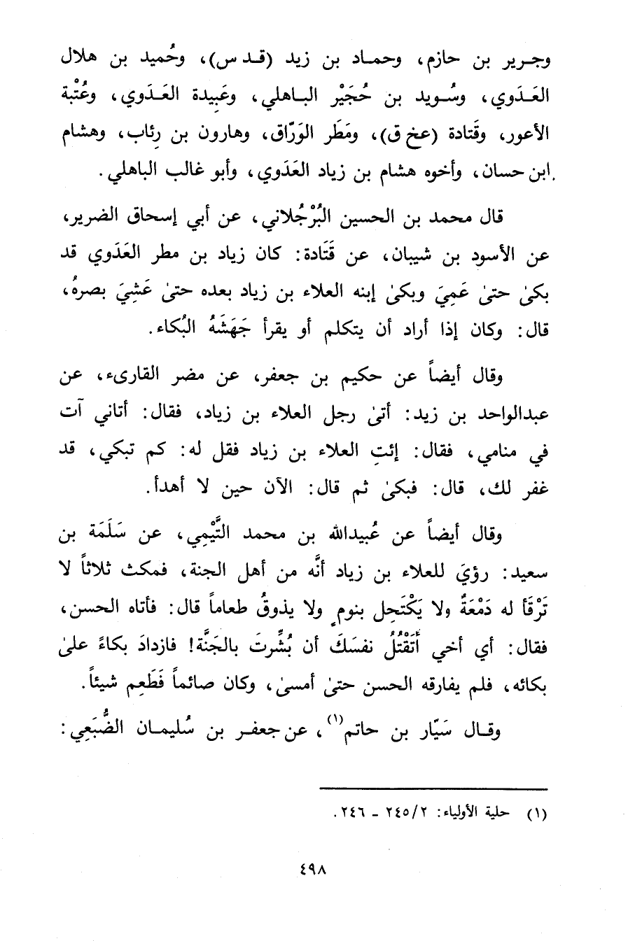 وَقَال أيضا عَنْ عُبَيد اللَّه بْن مُحَمَّد التَّيْمِيّ، عَنْ سلمة بْن سَعِيد: رؤي للعلاء بْن زياد أنه من أهل الجنة، فمكث ثلاثا لا ترقأ له دمعة ولا يكتحل بنوم ولا يذوق طعاما قال: فأتاه الحسن، فقال: أي أخي أتقتل نفسك أن بشرت بالجنة! فازداد بكاء على بكائه، فلم يفارقه الحسن حتى أمسى، وكان صائما فطعم شيئا.
