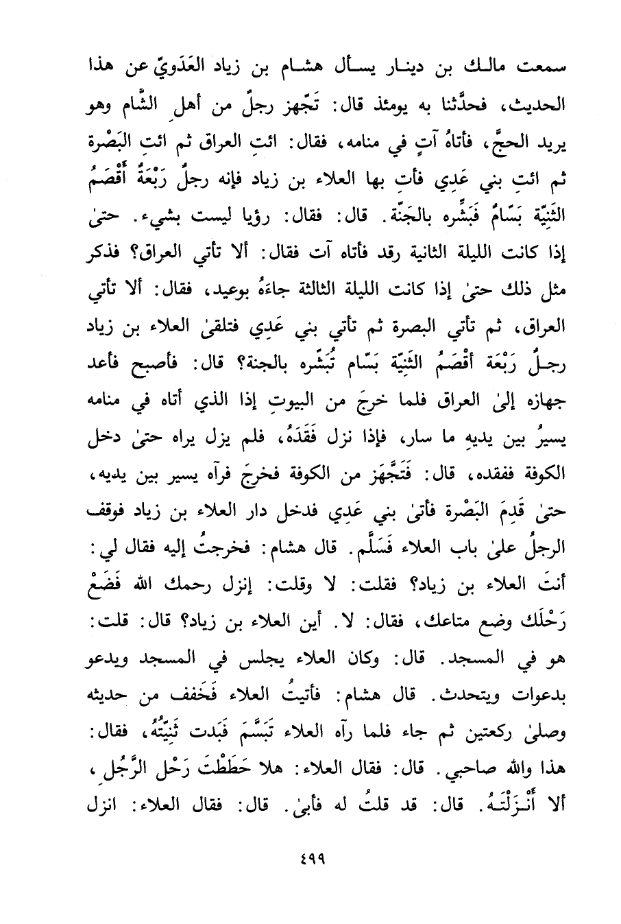 سمعت مالك بْن دينار يسأل هشام بْن زياد العدوي عَنْ هذا الحديث، فحَدَّثَنَا به يومئذ قال: تجهز رجل من أهل الشام وهو يريد الحج، فأتاه آت في منامه، فقال: ائت العراق ثم ائت البصرة ثم ائت بني عدي فأت بها العلاء بْن زياد فإنه رجل ربعة أقصم الثنية بسام فبشره بالجنة. قال: فقال: رؤيا ليست بشيءٍ. حتى إذا كانت الليلة الثانية رقد فأتاه آت فقال: ألا تأتي العراق؟ فذكر مثل ذلك حتى إذا كانت الليلة الثالثة جاءه بوعيد، فقال: ألا تأتي العارق، ثم تأتي البصرة ثم تأتي بني عدي فتلقى العلاء بْن زياد رجل ربعة أقصم الثنية بسام تبشره بالجنة؟ قال: فأصبح فأعد جهازه إلى العراق فلما خرج من البيوت إذا الذي أتاه في منامه يسير بين يديه ما سار، فإذا نزل فقده، فلم يزل يراه حتى دخل الكوفة ففقده، قال: فتجهز من الكوفة فخرج فرآه يسير بين يديه، حتى قدم البصرة فأتى بني عدي فدخل دار العلاء بْن زياد فوقف الرجل على باب العلاء فسلم. قال هشام: فخرجت إليه فقال لي: أنت العلاء بْن زياد؟ فقلت: لا وقلت: إنزل رحمك اللَّه فضع رحلك وضع متاعك، فقال: لا، أين العلاء بْن زياد؟ قال: قلت: هو في المسجد. قال: وكان العلاء يجلس في المسجد ويدعو بدعوات ويتحدث. قال هشام: فأتيت العلاء فخفف من حديثه وصلى ركعتين ثم جاء فلما رآه العلاء تبسم فبدت ثنيته، فقال: هذا واللَّه صاحبي. قال: فقال العلاء: هلا حططت رحل الرجل، ألا أنزلته. قال: قد قلت له فأبى. قال: فقال العلاء: انزل