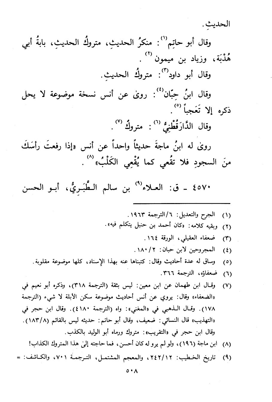 (7) وَقَال ابن طهمان عن ابن مَعِين: ليس بثقة (الترجمة 318) ، وذكره أبو نعيم في "الضعفاء "وَقَال: يروي عن أنس أحاديث موضوعة سكن الابلة لا شيء (الترجمة 178) .