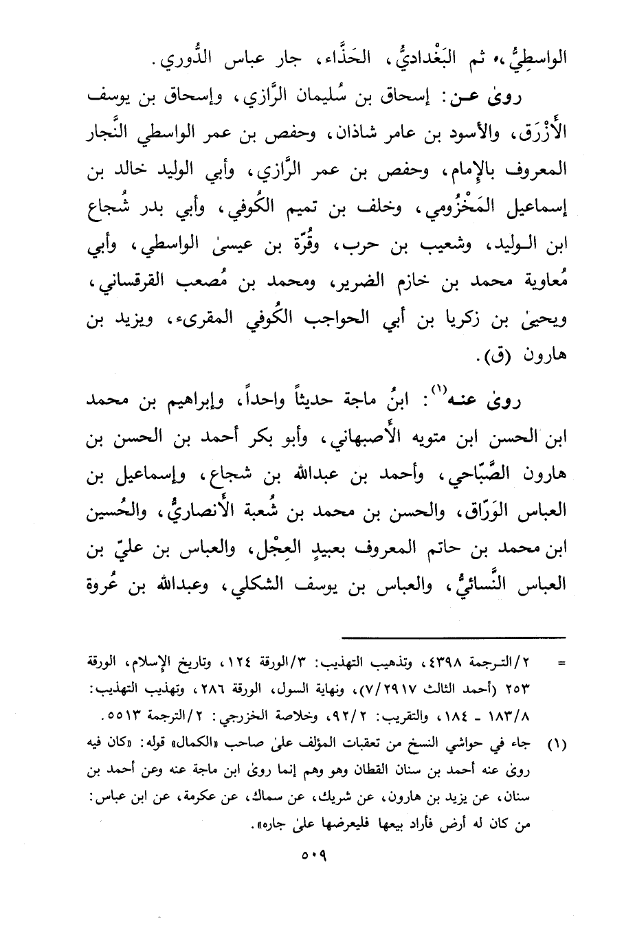 (1) جاء في حواشي النسخ من تعقبات المؤلف على صاحب "الكمال "قوله: "كان فيه روى عنه أَحْمَد بْن سنان القطان وهو وهم إنما روى ابن ماجة عنه وعن أحمد بن سنان، عَن يزيد بْن هارون، عَن شَرِيك، عن سماك، عَنْ عكرمة، عَنِ ابْن عَبَّاس: من كان له أرض فأراد بيعها فليعرضها على جاره ".