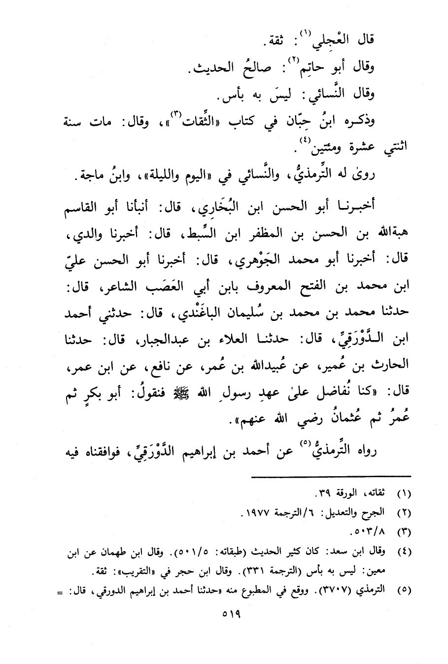 أَخْبَرَنَا أبو الحسن بْن البخاري، قال: أَنْبَأَنَا أَبُو الْقَاسِمِ هِبَةُ اللَّهِ بن الحسن بن المظفر ابن السِّبْطِ، قال: أَخْبَرَنَا والِدِي، قال: أَخْبَرَنَا أَبُو مُحَمَّد الجوهري، قال: أخبرنا أبو الحسن علي ابن مُحَمَّدِ بْنِ الْفَتْحِ الْمَعْرُوفُ بِابْنِ أَبي الْعَصَبِ الشَّاعِرُ، قال: حَدَّثَنَا مُحَمَّد بْن مُحَمَّد بْن سُلَيْمان الْبَاغَنْدِيُّ، قال: حَدَّثَنِي أَحْمَدُ بْنُ الدَّوْرَقِيِّ، قال: حَدَّثَنَا الْعَلاءُ بْنُ عَبْدِ الْجَبَّارِ، قال: حَدَّثَنَا الْحَارِثُ بْنُ عُمَير، عَنْ عُبَيد اللَّهِ بْنِ عُمَر، عن نَافِعٍ، عن ابْنِ عُمَر، قال: كُنَّا نُفَاضِلُ عَلَى عَهْدِ رَسُولِ اللَّهِ صَلَّى اللَّهُ عَلَيْهِ وسَلَّمَ فَنَقُولُ: أَبُو بَكْر ثُمَّ عُمَر ثُمَّ عُثْمَان رضي الله عَنْهُمْ.