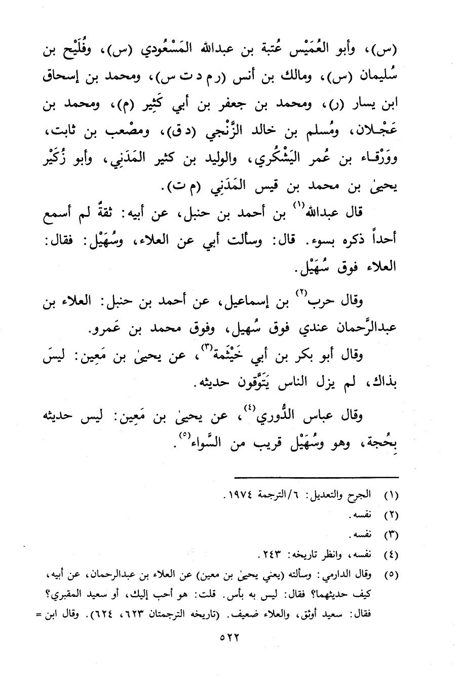(5) وَقَال الدارمي: وسألته (يعني يحيى بن مَعِين) عَنِ العلاء بْن عَبْد الرَّحْمَنِ، عَن أَبِيهِ، كيف حديثهما؟ فَقَالَ: ليس به بأس. قلت: هُوَ أحب إليك، أو سَعِيد المقبري؟ فقال: سَعِيد أوثق، والعلاء ضعيف. (تاريخه الترجمتان 623، 624) . وَقَال ابن =
