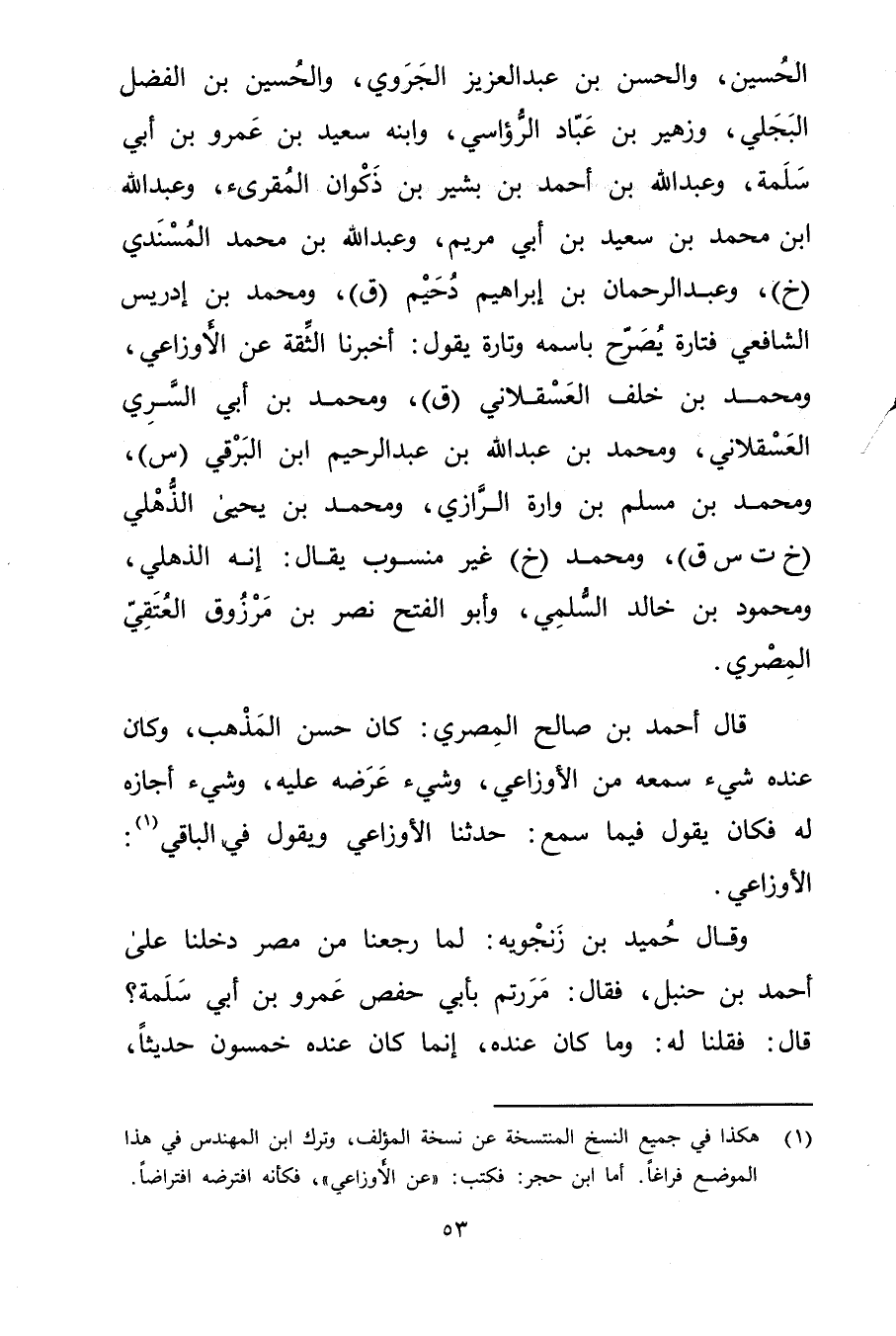(1) هكذا في جميع النسخ المنتسخة عن نسخة المؤلف، وترك ابن المهندس في هذا الموضع فراغا. أما ابن حجر: فكتب: "عن الأَوزاعِيّ "، فكأنه افترضه افتراضا.