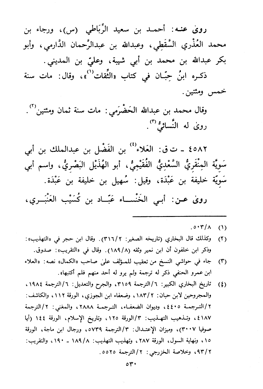 (3) جاء في حواشي النسخ من تعقيب للمؤلف على صاحب "الكمال "نصه: "العلاء ابن عَمْرو الحنفي ذكر له ترجمة ولم يرو لَهُ أحد منهم فلم أكتبها.