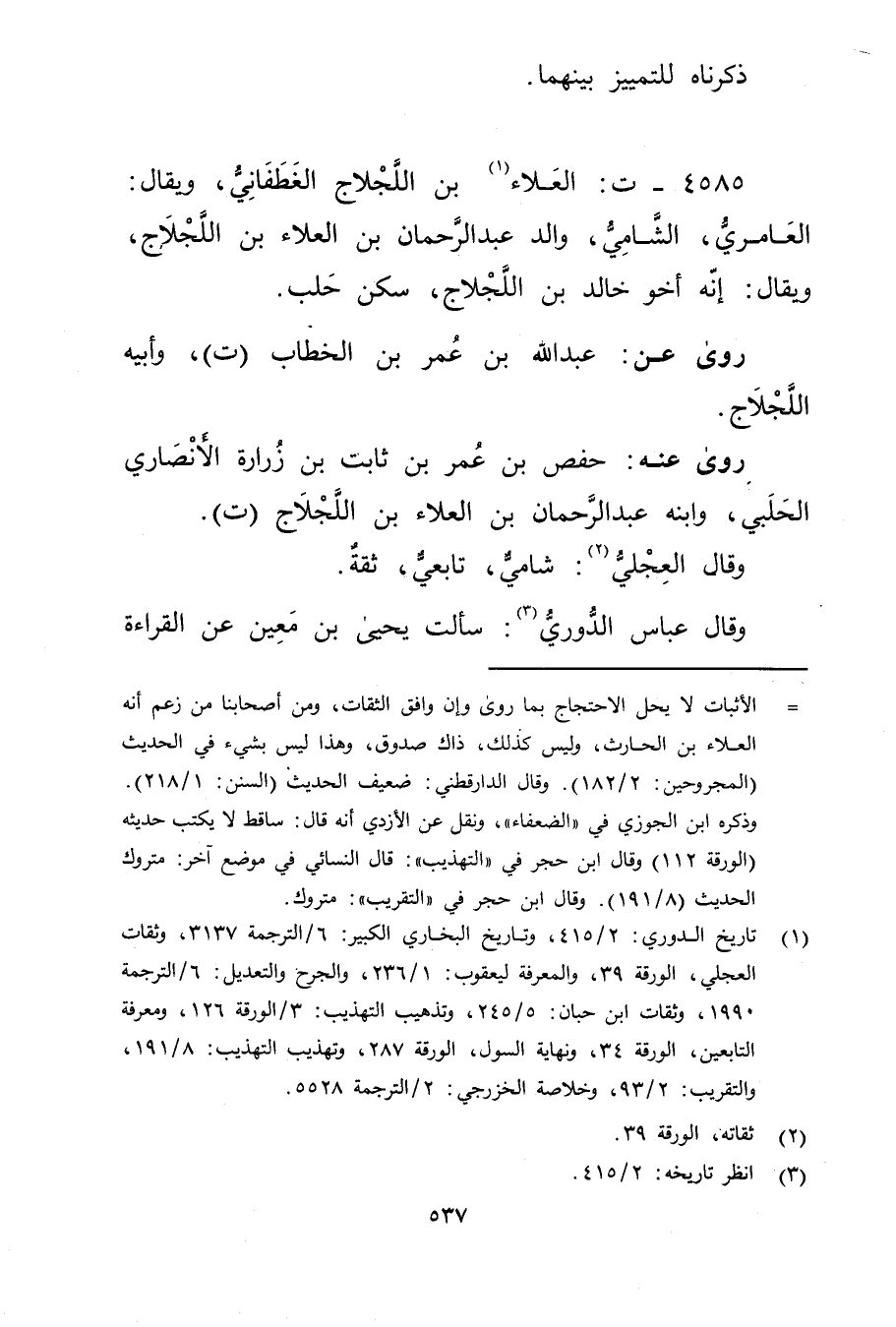 4585 - ت: العلاء بن اللجلاج الغطفاني (1) ، ويُقال: العامري، الشامي، والد عَبْد الرحمن بْن العلاء بْن اللجلاج، ويُقال: إنه أخو خالد بْن اللجلاج، سكن حلب.