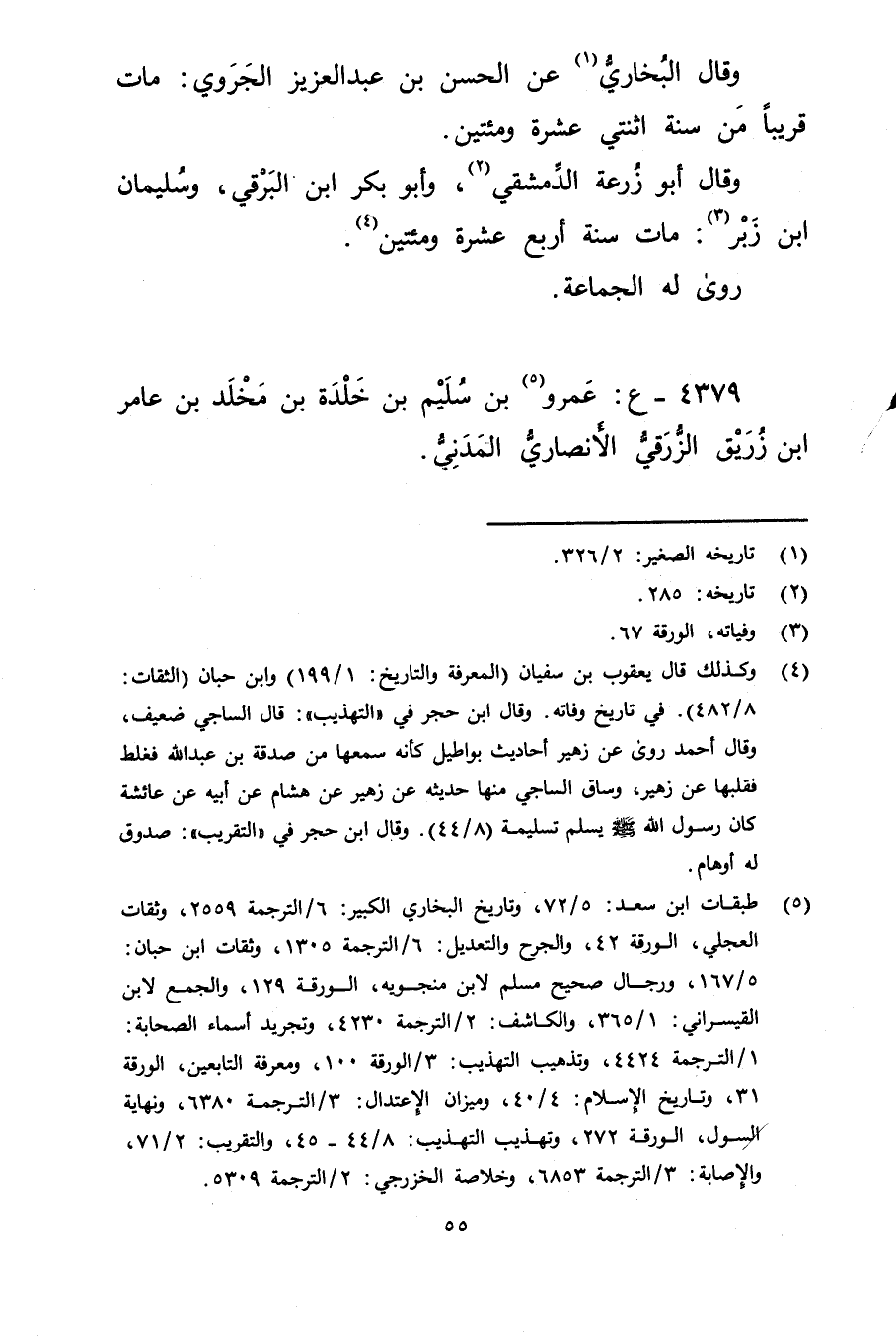 4379 - ع: عَمْرو بن سليم بن خلدة بن مخلد بن عامر ابن زريق الزرقي الأَنْصارِيّ المدني (5) .